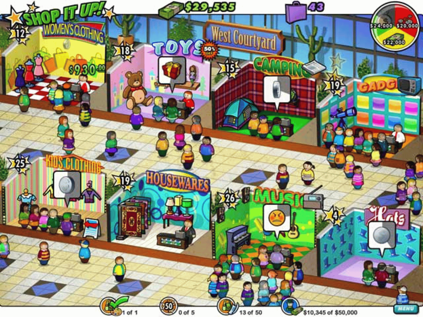 It's the grand opening of the new mall, and the customers are already inside, but the mall isn't ready yet! Your skills are needed to open and decorate new shops. Boost profits with dazzling inventory displays and fancy advertisements. Once the mall gets busy, hire assistants and cashiers to help with all the customers. As the new boss, you'll need to take advice and meet challenges from the local business leaders. Fun is in the bag when you play Shop it Up!