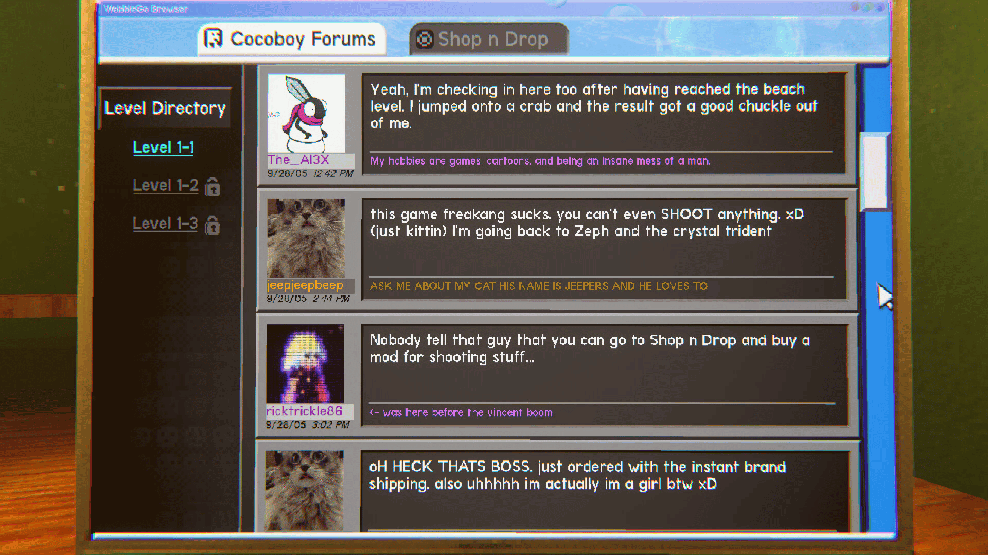 COCOBOY is a 2D puzzle platformer within a 3D retro gaming simulation. Hack an ’80s cult classic with modded abilities, decorate your bedroom with rare collectibles, and scour a 2005 gaming forum where a peculiar fandom takes root.