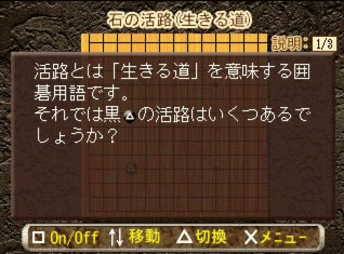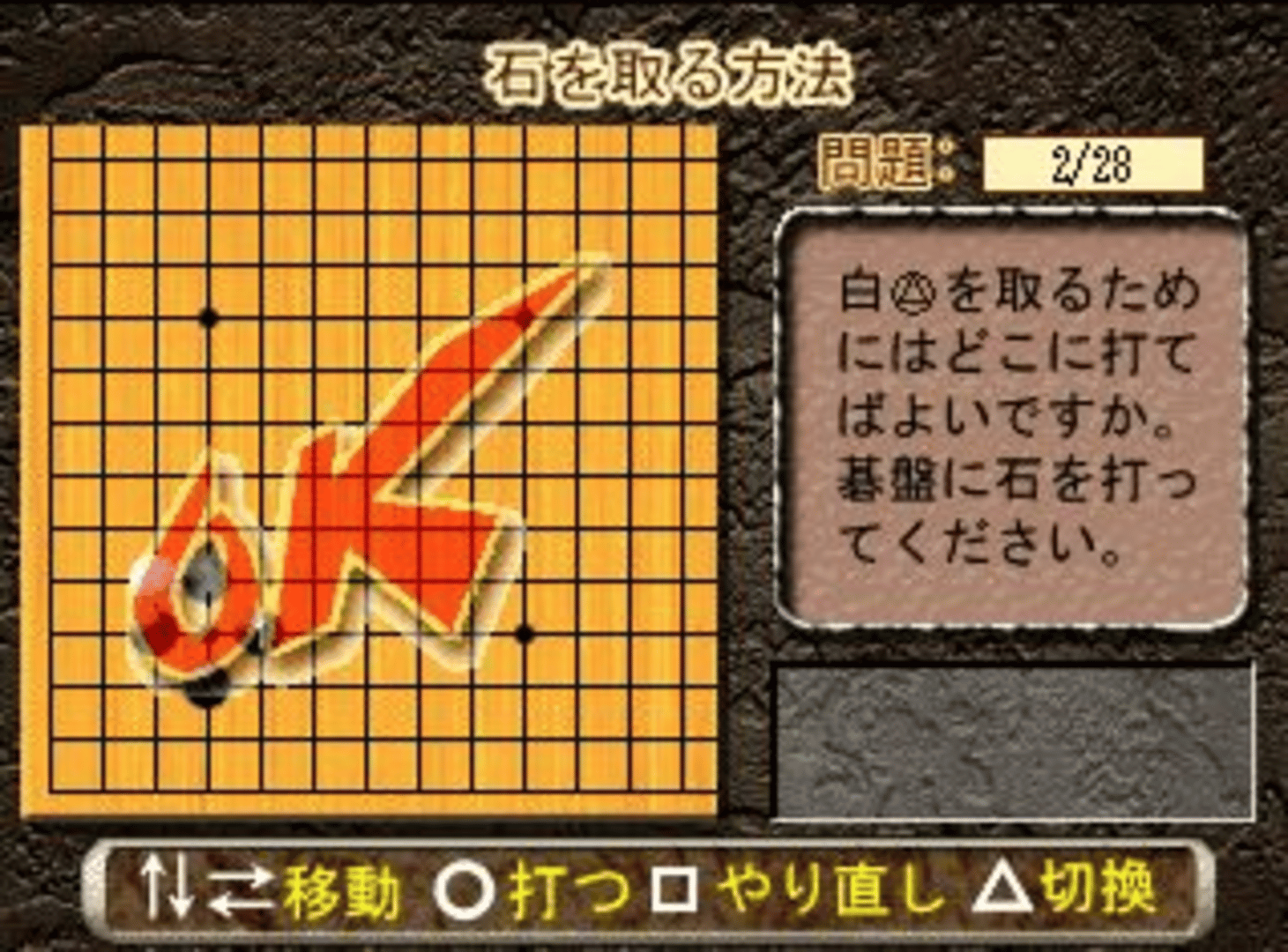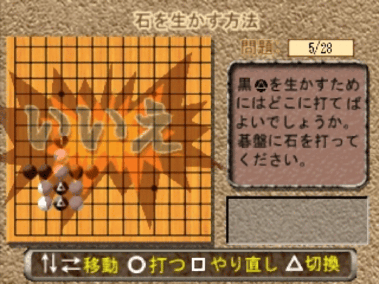 Minna Atsumore! Igo Kyoushitsu is a learning game that teachs players how to play go, the game features hundreds of different situations and depending of the player movement the game will say it the movement is the right one or not. The game features different background images.