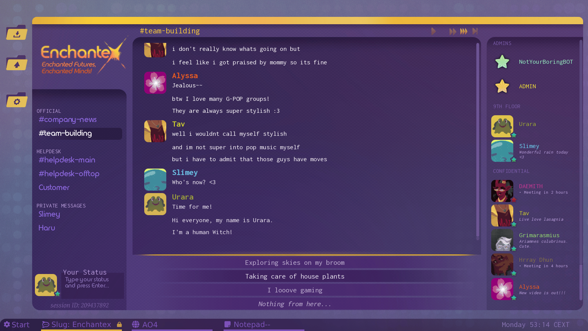 Enchantex is an urban fantasy queer dating chat-sim with visual novel elements. Play as a Wizard, Witch or Wix, pick your name, icon and hobbies, help customers in need and, of course, find love... Either on the AO4 webpage or near the lava cooler.