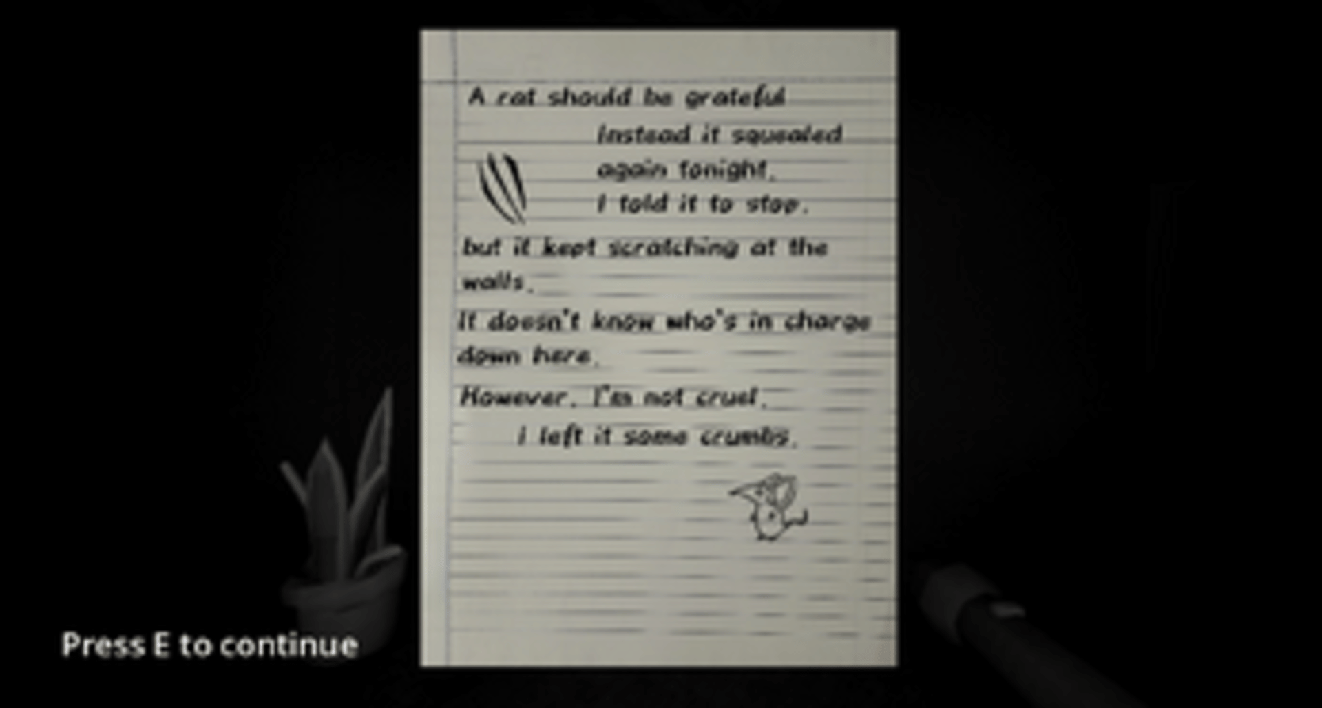 "You are not alone. But maybe you never were." Can you hear the voices too? The sounds? Or am I alone within these four walls? Take on the shoes of a trapped man, roam to find a way out. Maybe you will find some secrets too. But remember to ask yourself who the parasite truly is. You wouldn't want someone snapping your neck from behind.