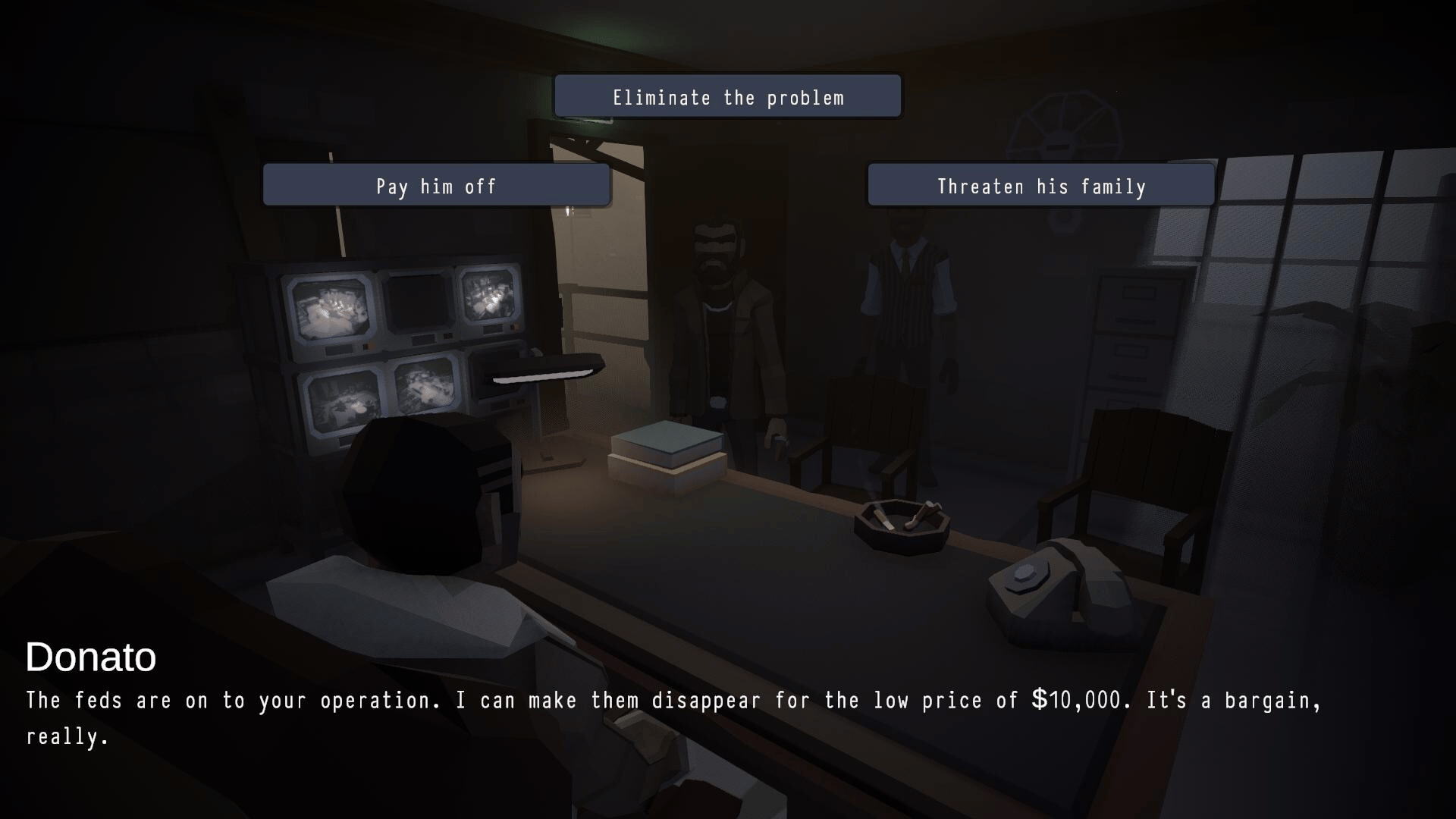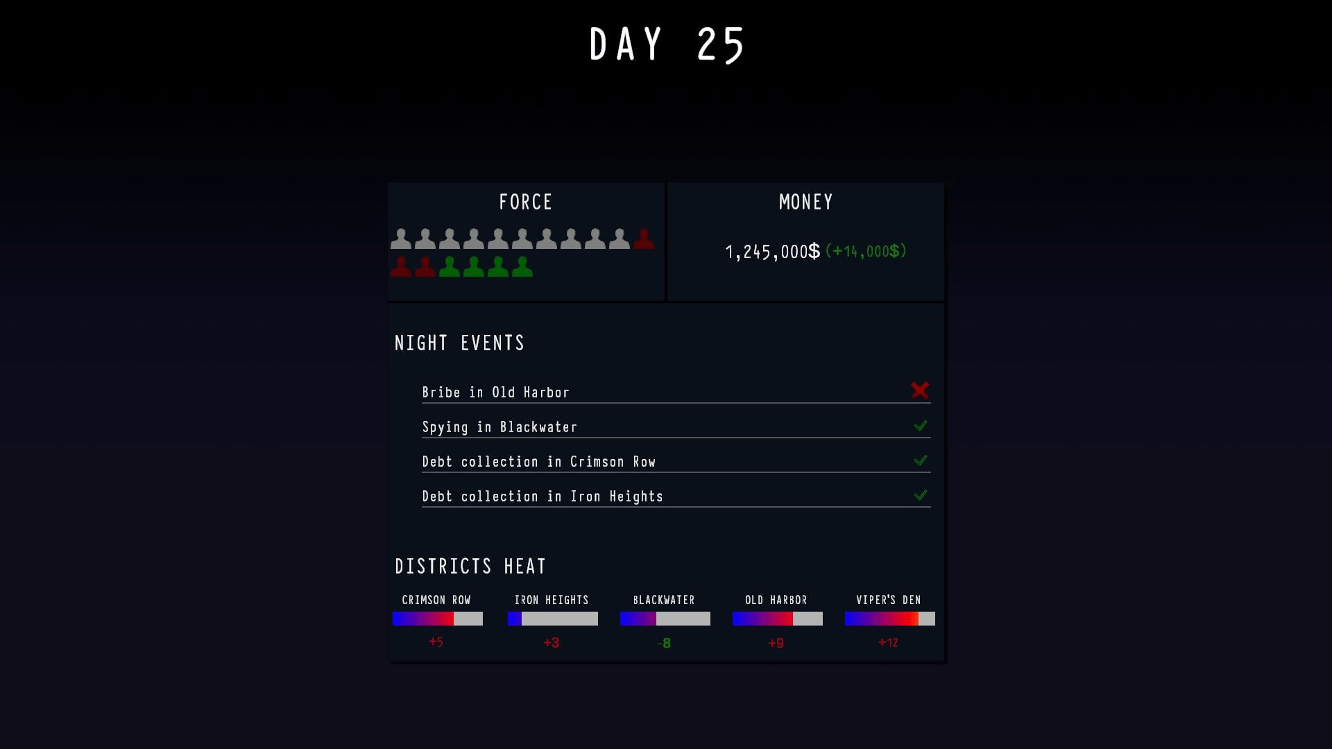 Under His Eyes is a gritty, story-driven strategy game where you play a crime boss. Make game-changing decisions, manage your crew and income, send operatives on missions, seize districts, and eliminate rivals. Will you rise through subtlety, rule with fear, or fall to a small-time gang?