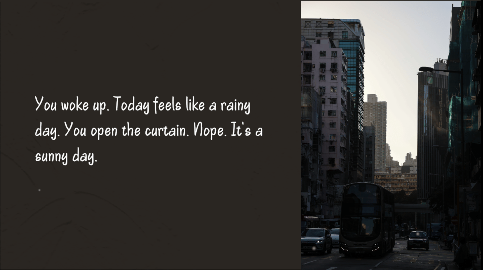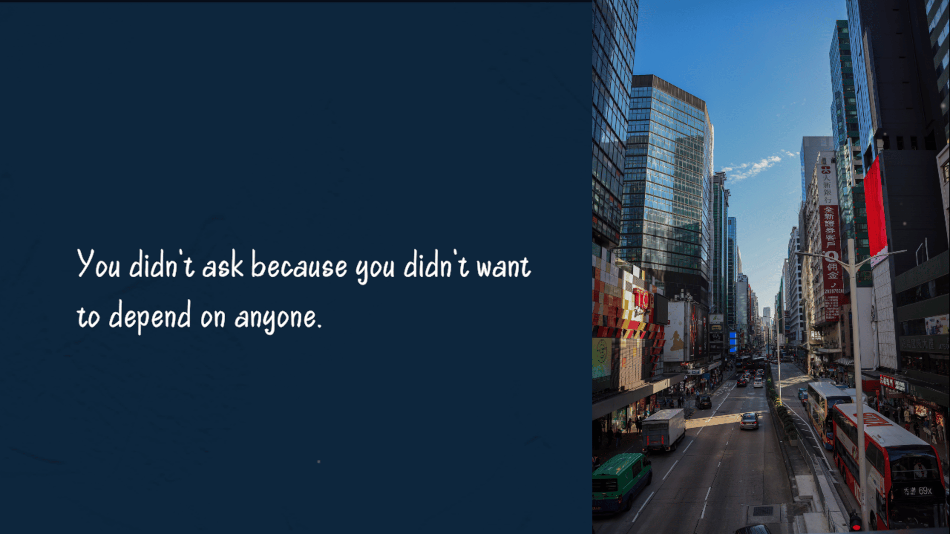 Travel through all locations, and recall the things that you lost. You lost more than your wife. A 5-minute visual novel with photos of Hong Kong.