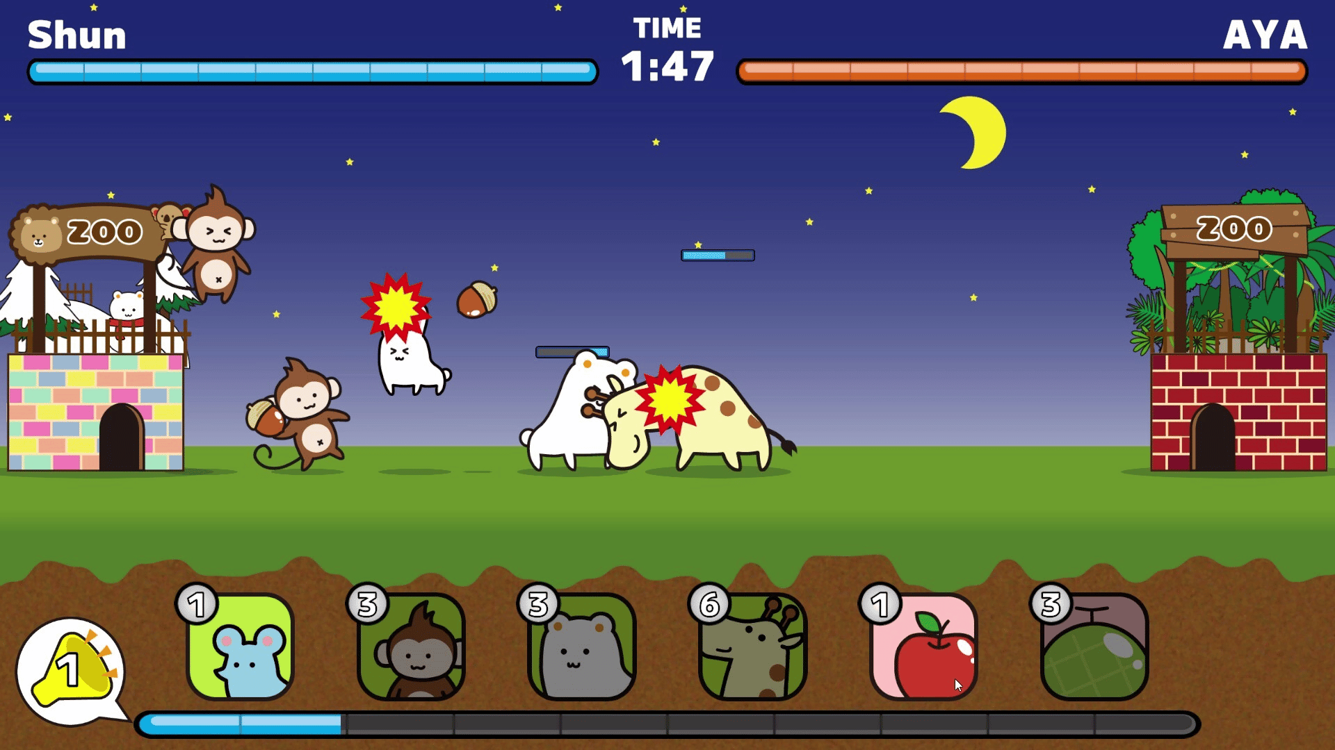 Battle with cute animals and fruits! Build a deck of 6 cards and battle in this simple yet deep, real-time online PvP tower defense for two players!
