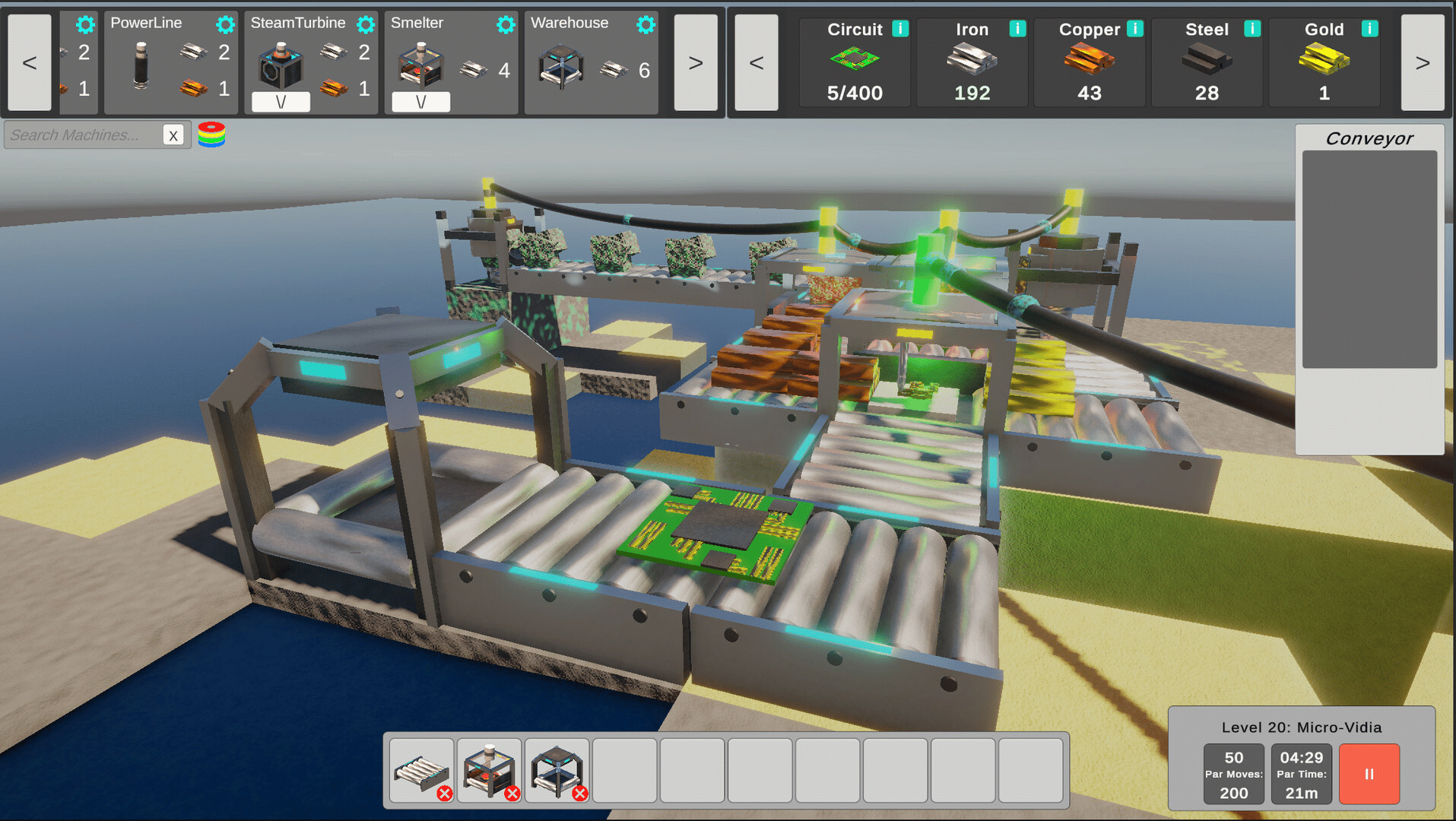 MicroMechanica is a top-down factory-building puzzle game across unique biomes. Build machines, collect resources, and optimize factories in 20 handcrafted levels. Unlock new mechanics, colors, and patterns, with more levels and a procedurally generated world coming soon!