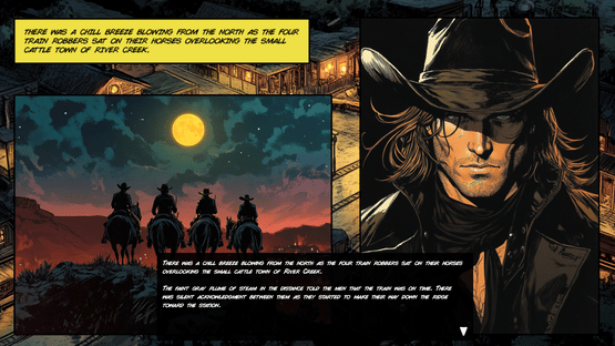 Atonement is an interactive graphic novel set in the Wild West. At various points in the story, you will be asked to make a choice, these choices will take you down different paths in the story. There are 3 storylines featuring a manhunt, a bank job, and a train robbery.