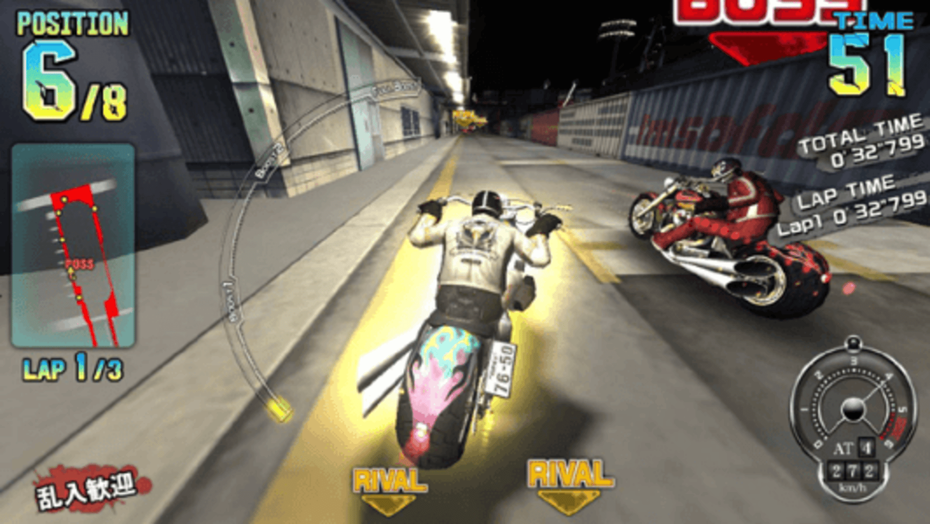 Hop on your choice of five bikes and race through crowded city streets in Bandai Namco’s Nirin! Five courses offer tons of compelling scenery and a range of difficulties. The gameplay is easy for first time users, but there is a definite advantage to the experienced rider who has mastered the boost feature. Bank hard through turns to build the boost meter, and then straighten the bike out to blast past your rivals! For even more speed, draft behind cars, trucks, and other motorcycles.