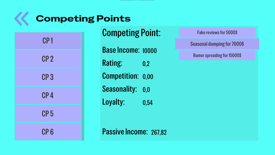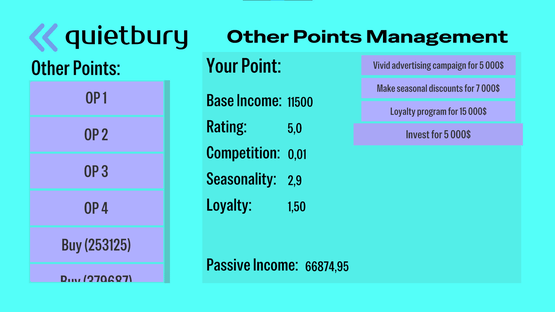 Business simulator with strategy elements, where you manage a network of order delivery points in the conditions of severe competition, gray schemes and unexpected risks. Develop your business, improve points, defend against competitors' attacks, conduct risky transactions in the gray market.