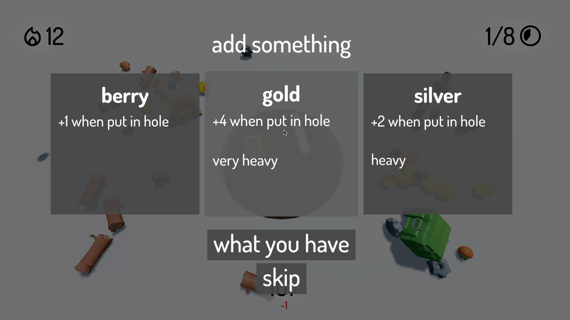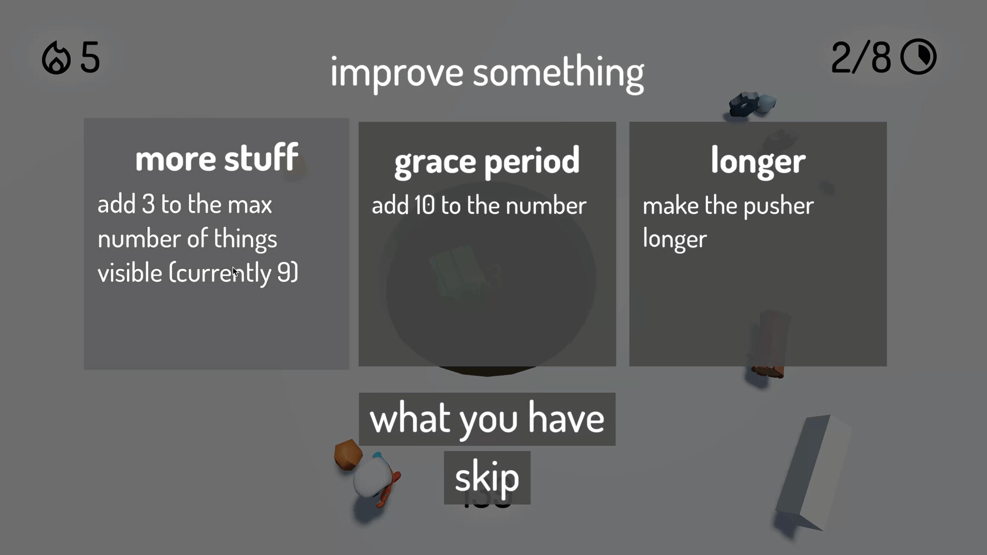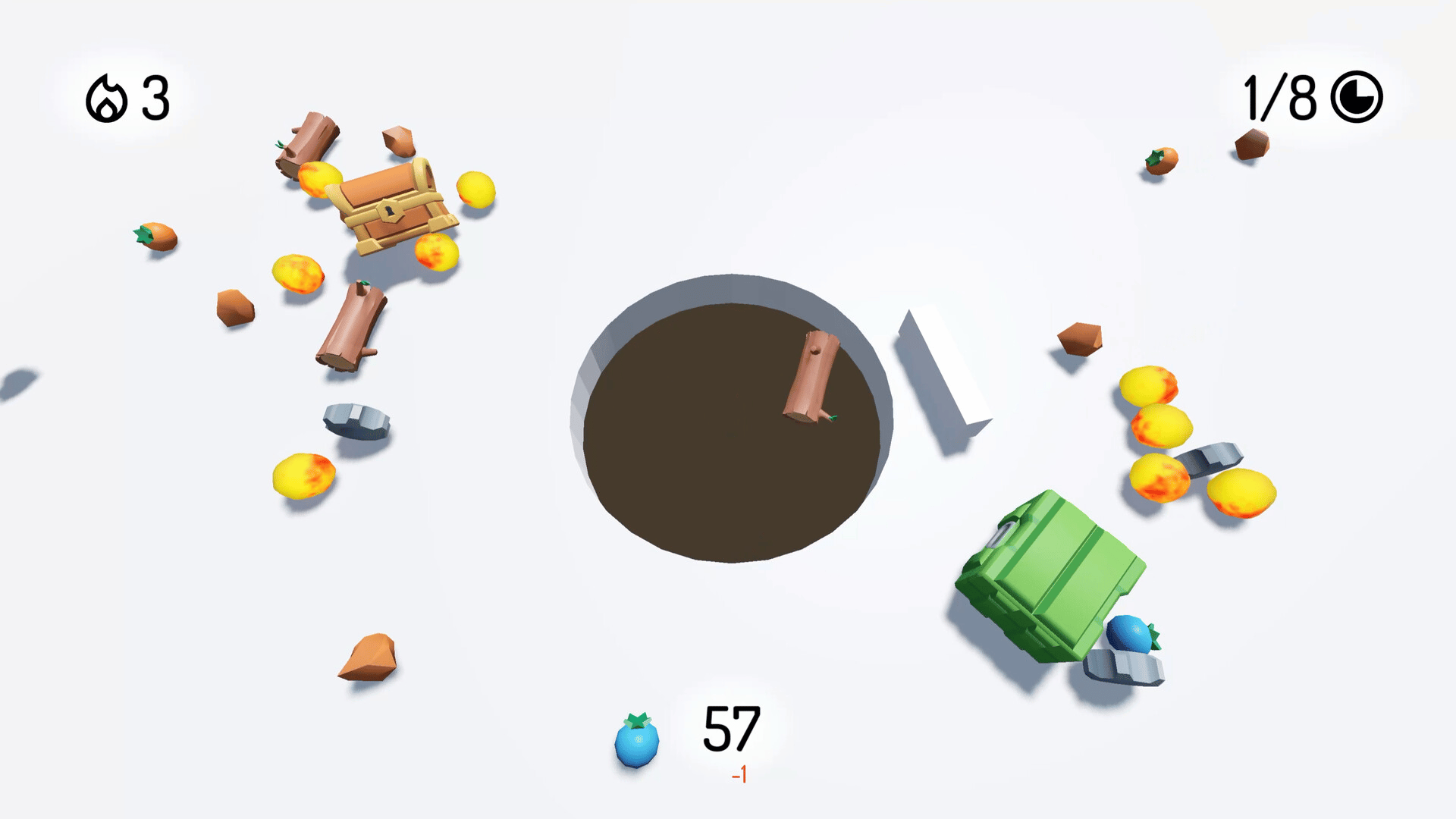 A game about shoving things into a hole. As you progress, unlock new things to put in the hole, helpers to push more stuff into the hole, and upgrades to make your pusher longer and stronger.