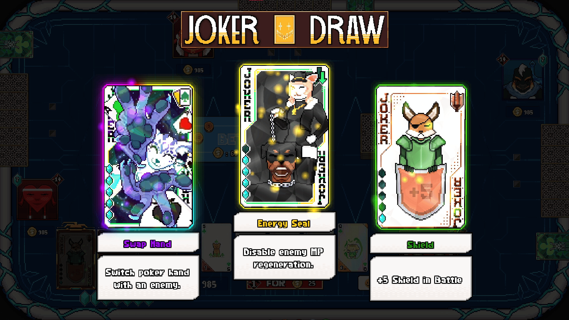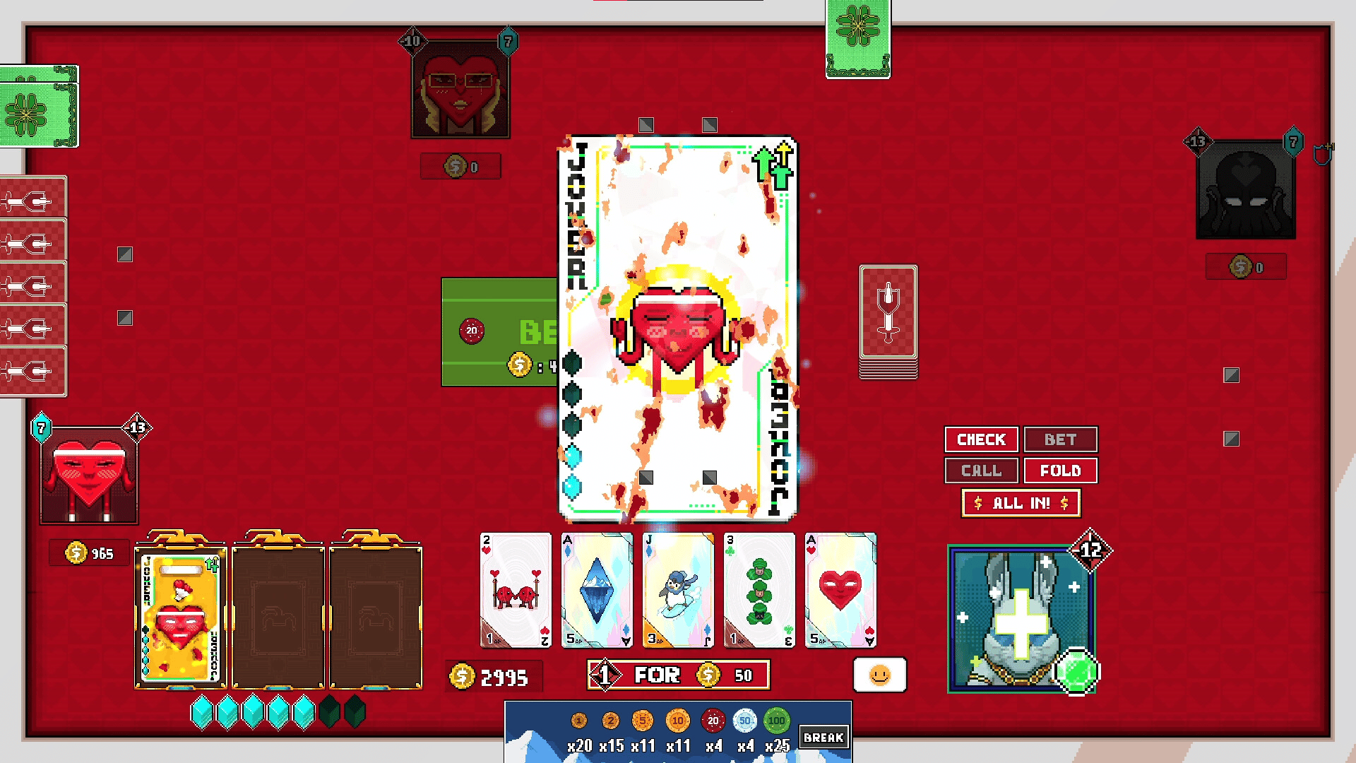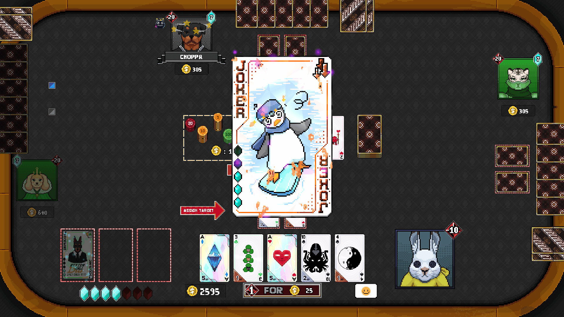 Draw a pair of aces, use them as poker hands or to eliminate your opponents? A poker roguelike battle card game. Build a deck of jokers, defeat bosses, modify cards, and conquer challenges across the ever-changing islands. At the table of four, win by chips or remaining health, your call...