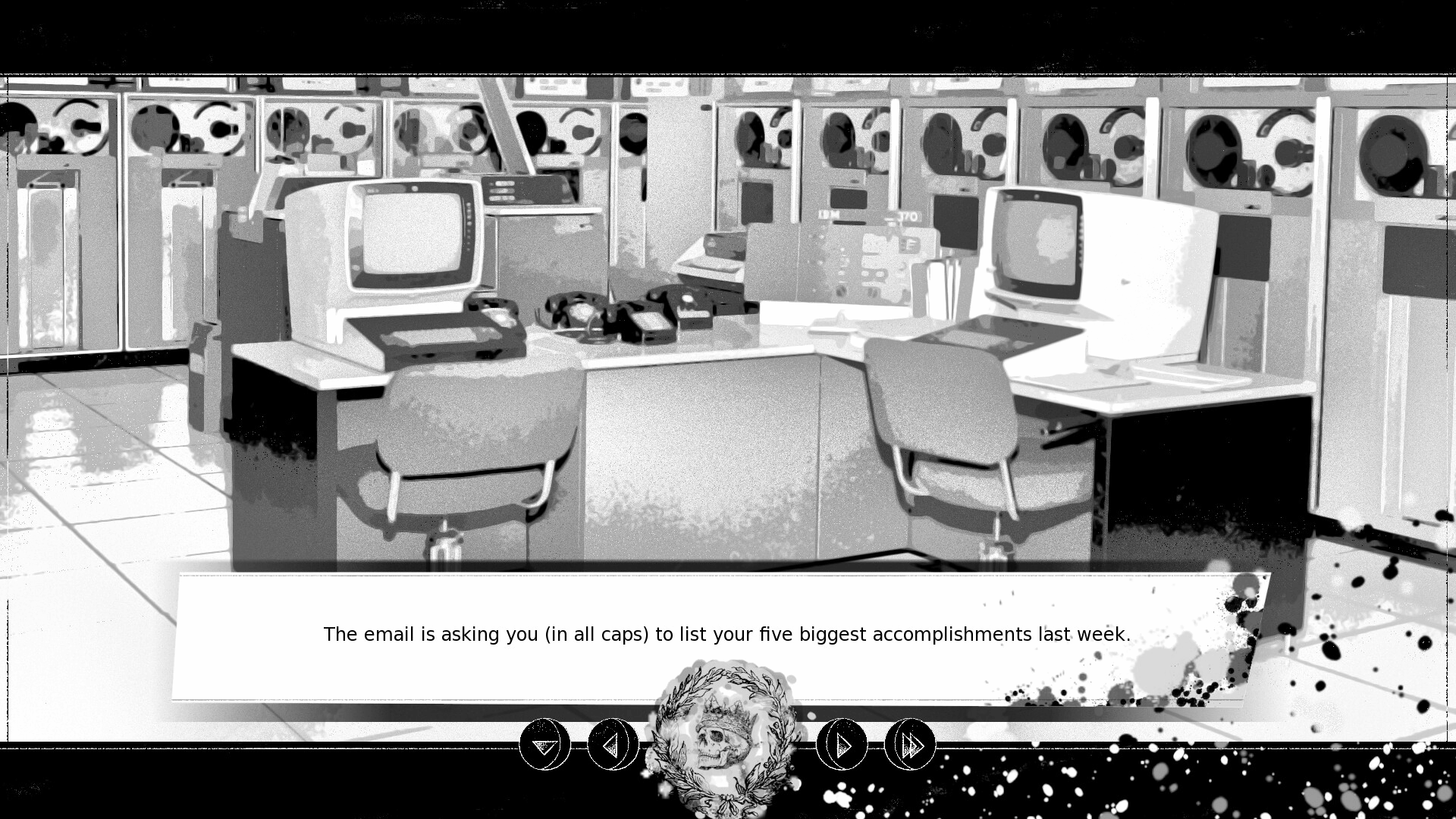 Five Biggest Accomplishments is a short Visual Novel where you play as someone who has held the same job for 30 years: push a button every 8 hours or the world will end. Suddenly, you get an email asking you to list your five biggest accomplishments for the week, or risk being fired.