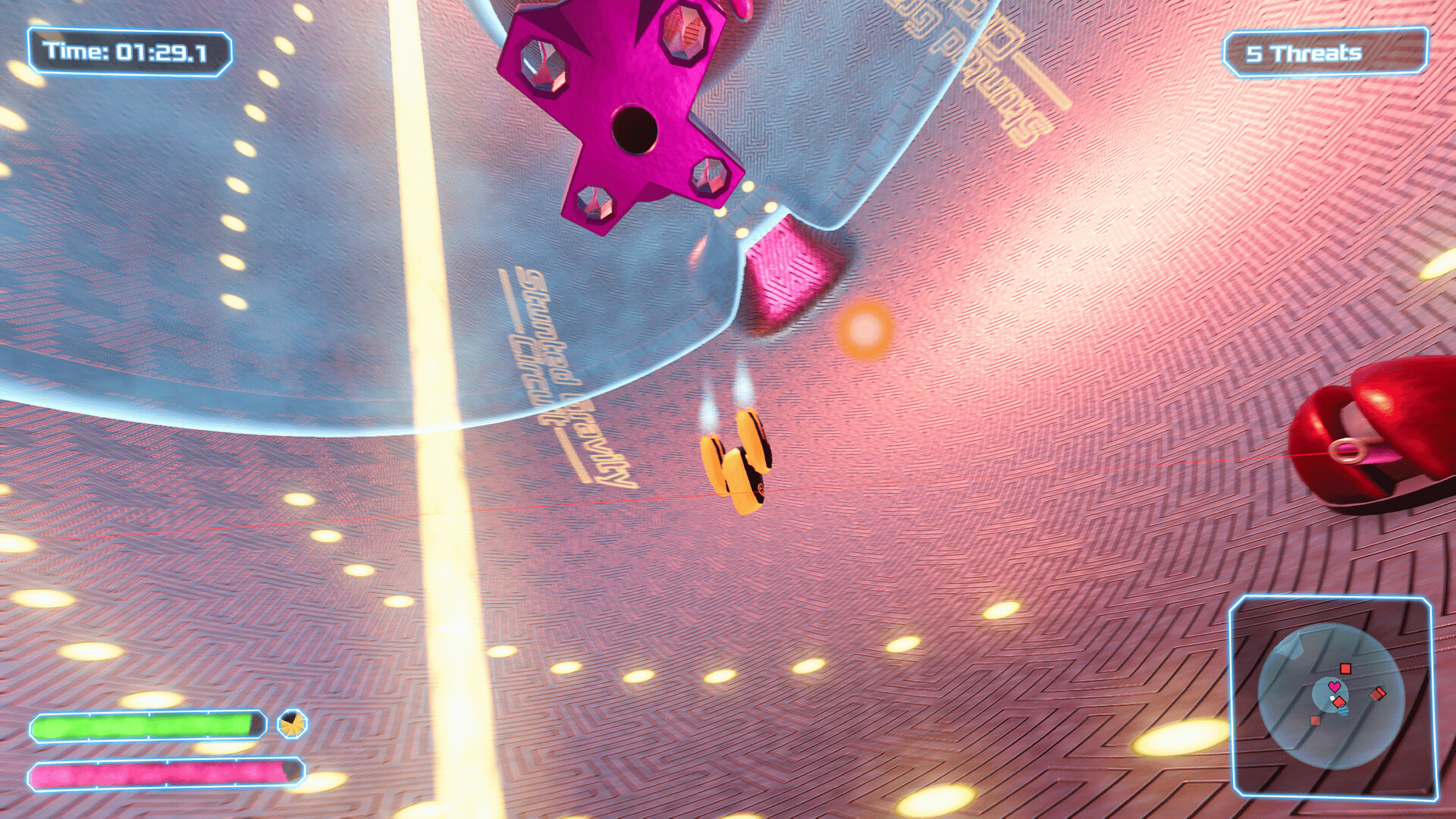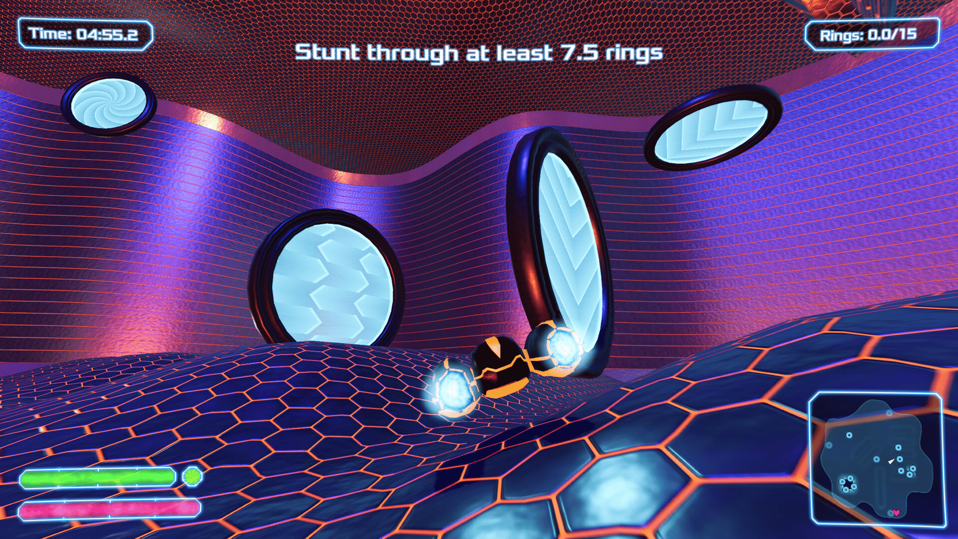 Stunted Gravity is a hovercraft stunt-driving game set in a neon-dystopian future. Race, jump, and improvise lines across arenas where gravity pulls in any and every direction. Execute stunts, evade hazards, and battle enemy drones as you pilot though the interplanetary Stunted Gravity Circuit.