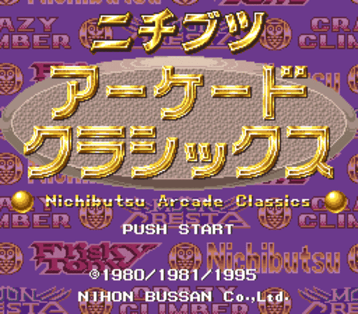 Nichibutsu Arcade Classics is a compilation for the Super Famicom and Sony PlayStation released in 1995. It features three of Nichibutsu's (or Nihon Bussan) Arcade games from the early 80s, adapted for consoles but otherwise left as-is. Contract developers Syscom were brought in to make the adaptations. It was followed up by Nichibutsu Arcade Classics 2, which contained the original 1979 Arcade version of Heiankyo Alien and a graphically enhanced remake. The games included are Crazy Climber (An action game where the protagonist scales a building. Best known for its complex controls that independently control each hand), Frisky Tom (An action game where the protagonist has to maintain a plumbing system and protect it from rogue rats), and Moon Cresta (A single-screen shoot 'em up similar to Galaxian in which the player's ship can dock with larger ships between stages to become more powerful).