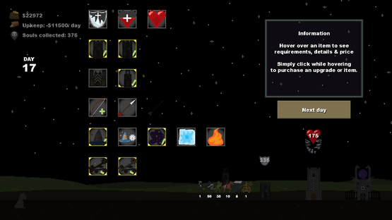Defend the Castle is a day-by-day tower defense roguelike where you face 5 enemy waves per day, upgrade between battles, and struggle to survive as enemies grow stronger. Make the right choices or fall. Some days bring... something else.