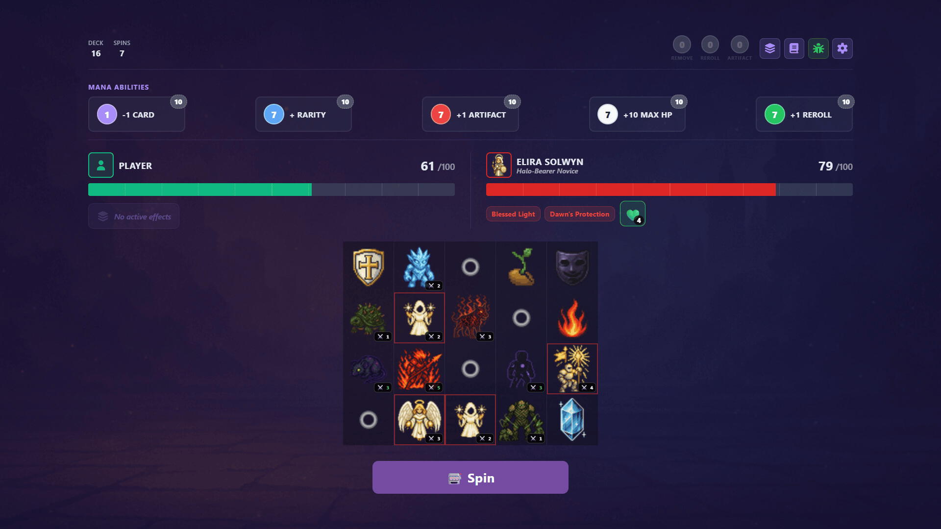 Battle wizards in this roguelike slot-battler! Spin the board to cast spells, summon creatures, and unleash powerful combos. Build your deck, unlock artifacts, and ascend through 15 unique wizard encounters. Every spin is a strategic decision!