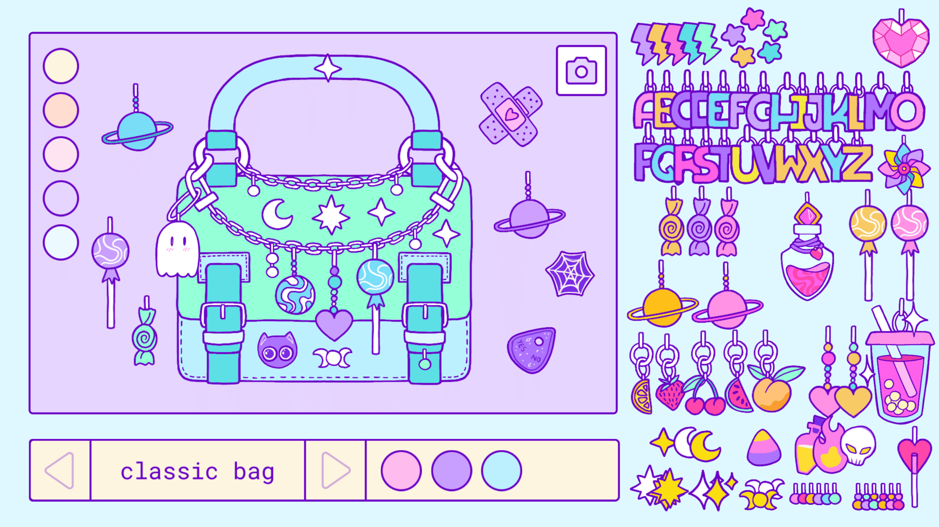 Trinket Bag Maker is a retro sandbox game inspired by the 2000's girl games, where you can create your own trinket bag! Choose between many adorable charms and bags to create the trinket bag of your dreams!