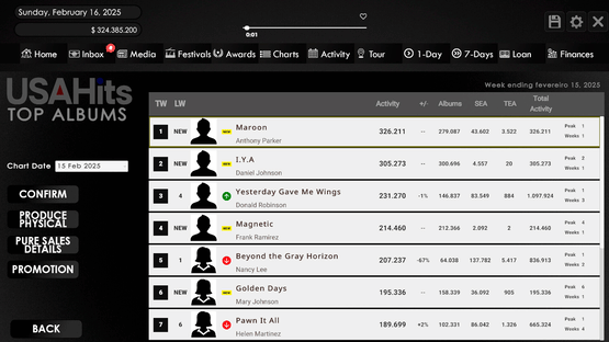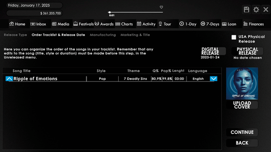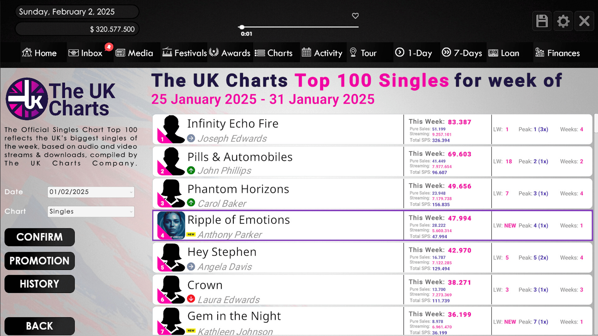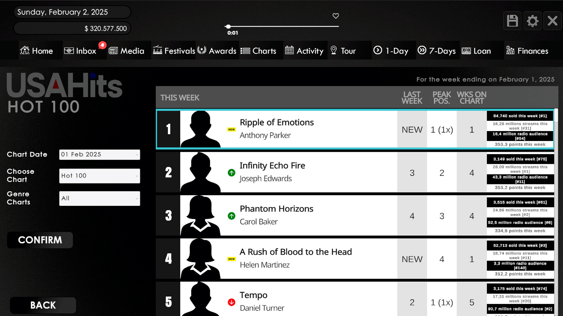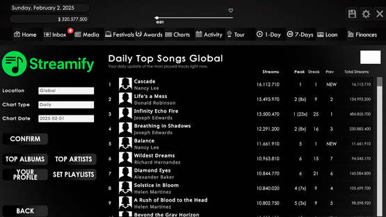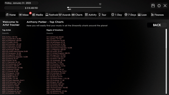 Streaming Race is a single-player management game about building and running the career of a music artist. Plan releases, choose singles, manage marketing campaigns, negotiate contracts and follow your results daily and week by week on detailed global charts.