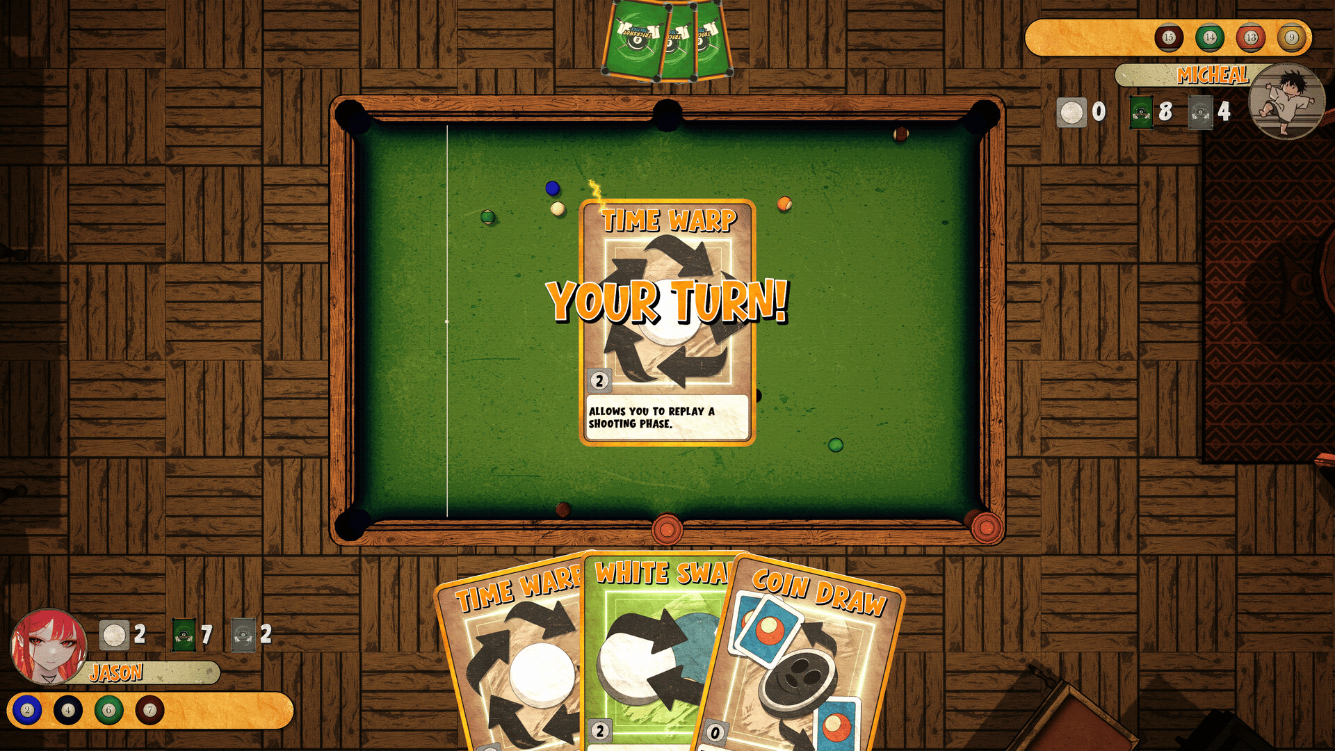 Billiards will never be the same again! Trickshot Tactics is where sharp minds meet sharper shots, a wild mix of deck building, strategy, and pure skill. Play your cards, bend the rules, and show who really knows how to handle a cue!