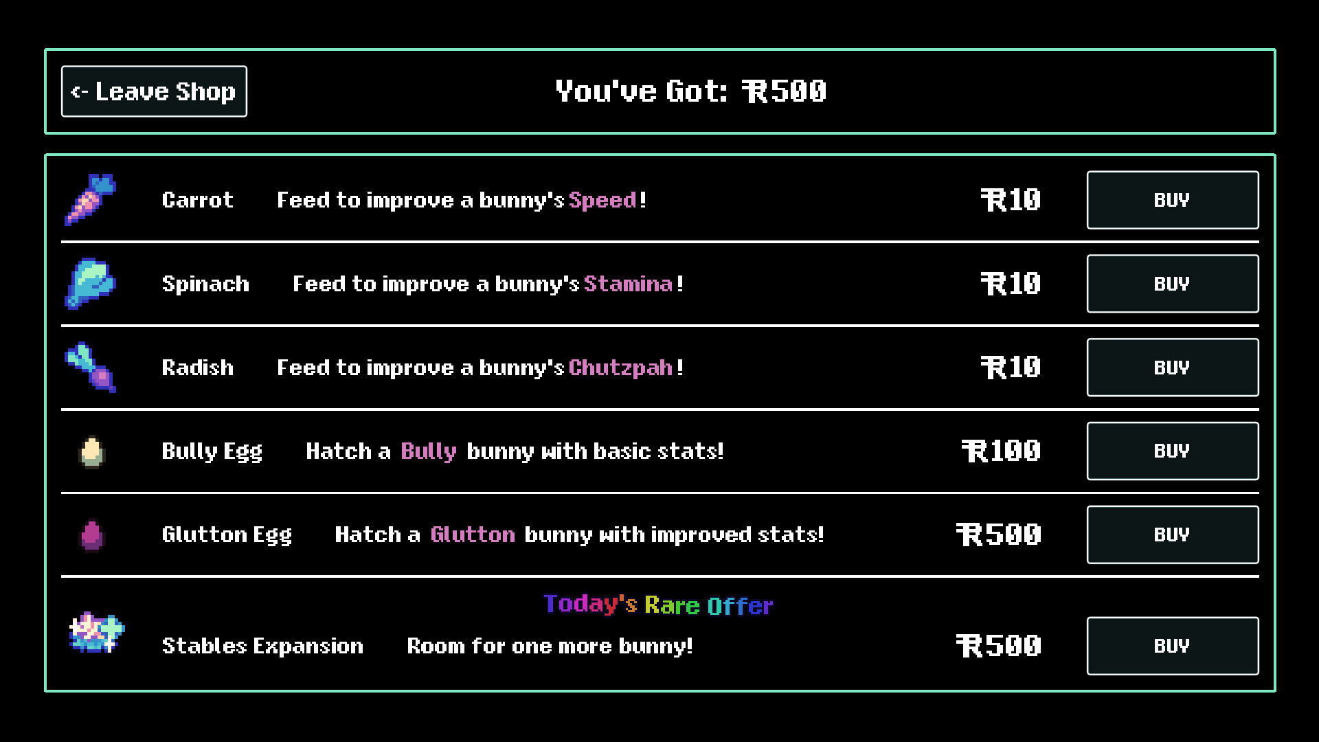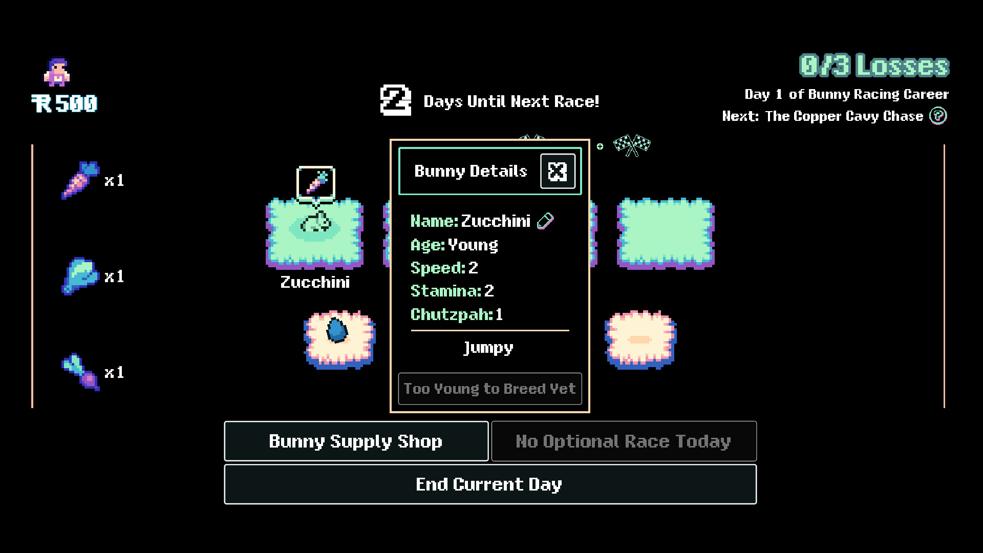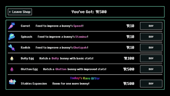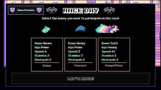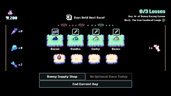 Raise, race and breed bunnies in a roguelike management sim like you've never experienced! Synergize your stable managers' abilities with your bunnies' natures and breed your best racers together to get faster and faster with every generation before time runs out and you face the championship race!