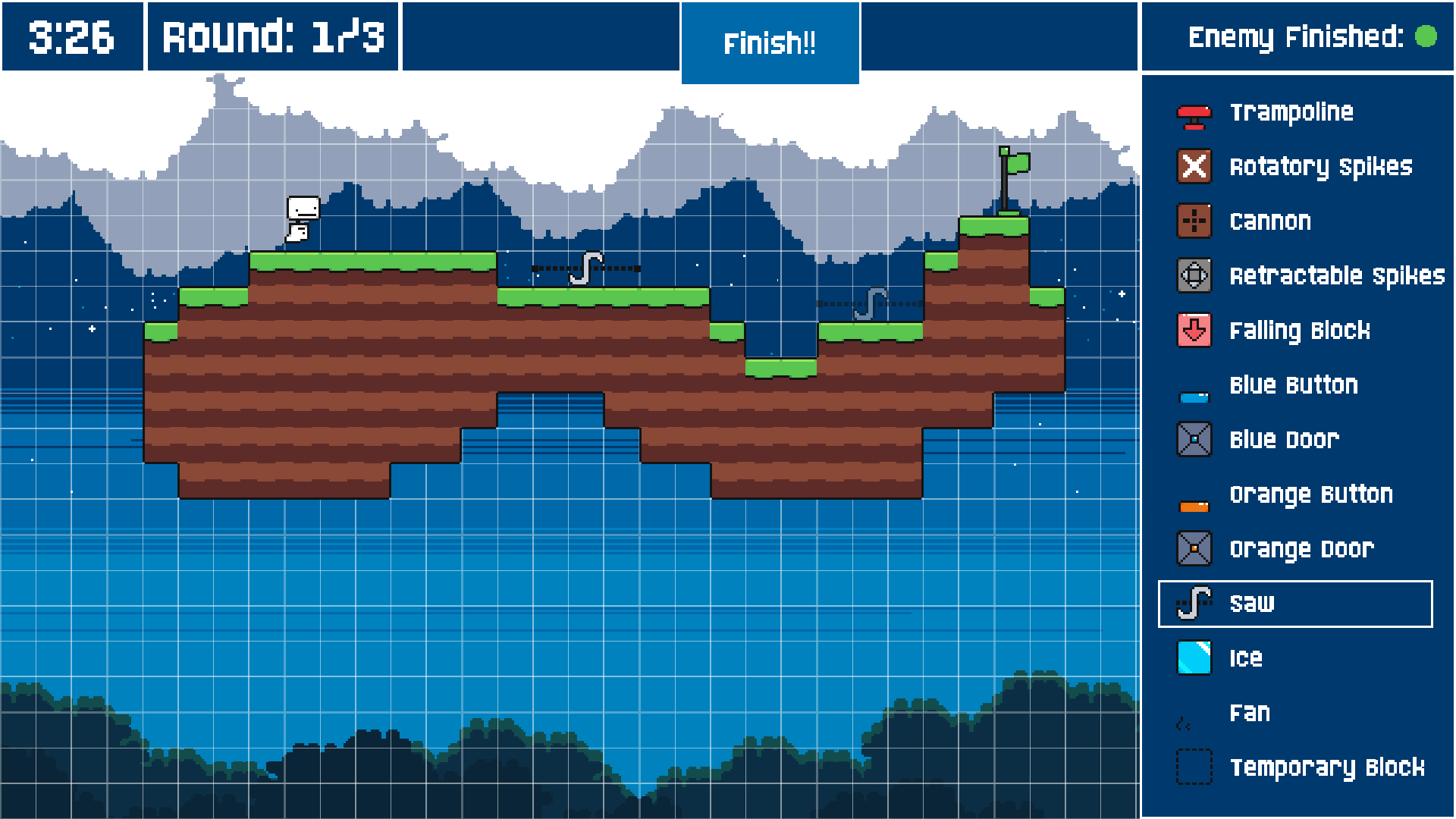LevelFighters is a competitive and creative platform game where two players design levels and then challenge each other to complete them faster than the other. Each game combines skill and creativity, with a built-in level editor that allows you to build unique challenges for your opponent.