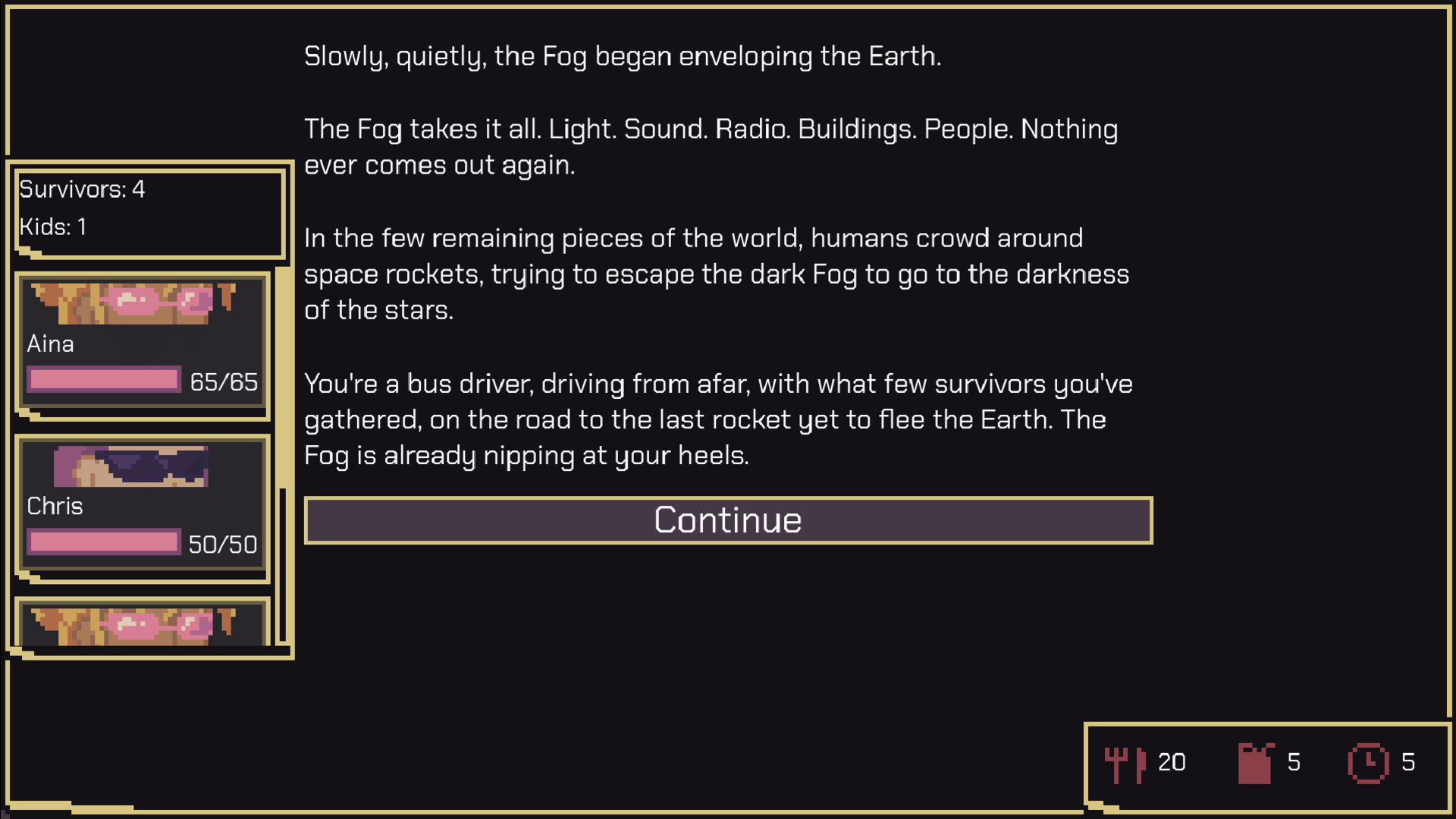 The Fog is enveloping the Earth The last hope for Humanity is reaching the spaceship bound to the stars before the Earth is swallowed whole. You're a bus driver, driving what few survivors are left to the launch pad. The Approaching Quiet is a turn-based tactical RPG about hard choices. Manage your food and fuel to reach your destination Decide who you can bring with you, and who will be left behind for the Fog The story and gameplay are different each run!