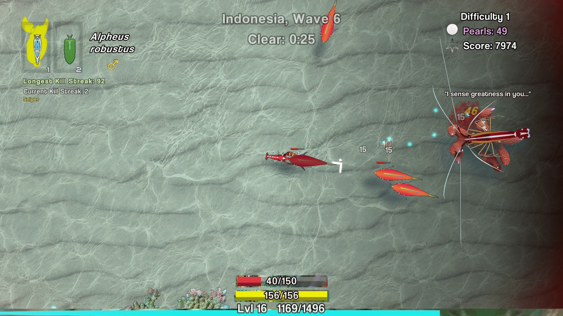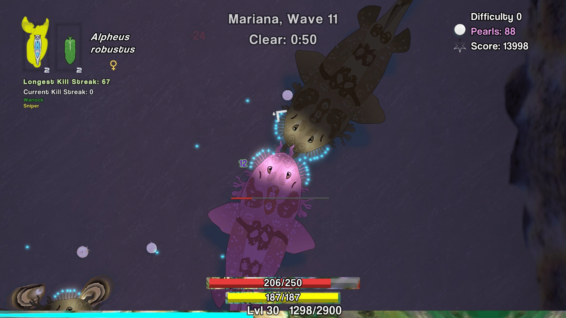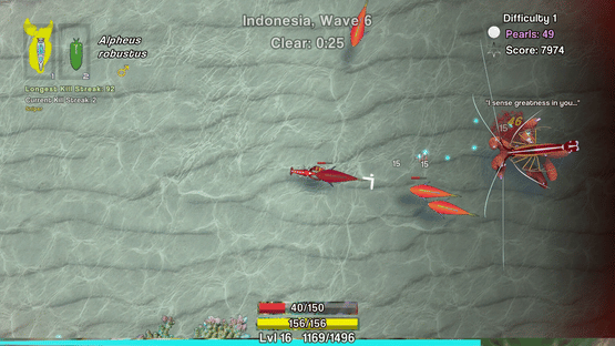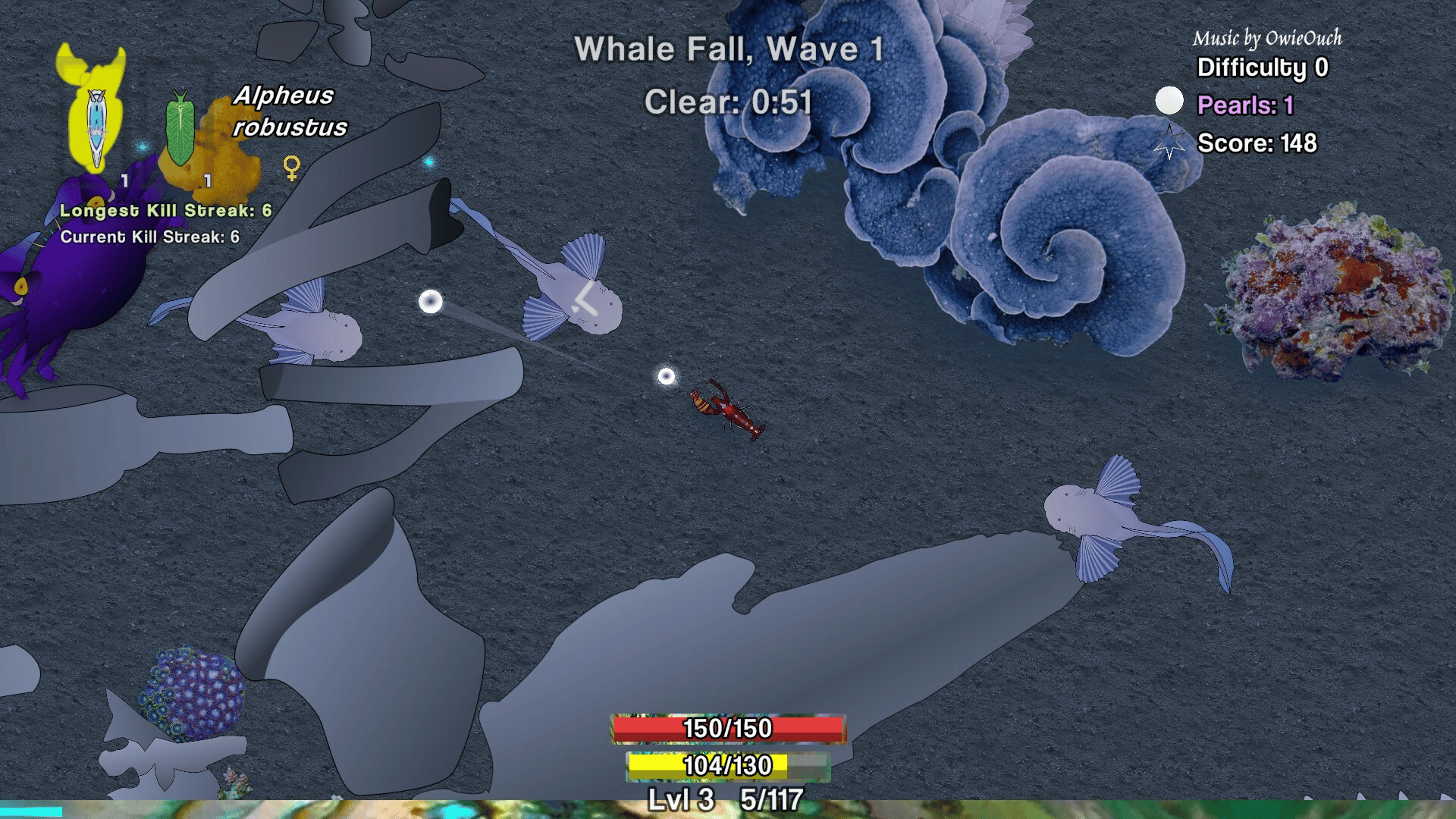Play as a pistol shrimp and survive waves of enemies while collecting pearls from oysters scattered throughout the map.