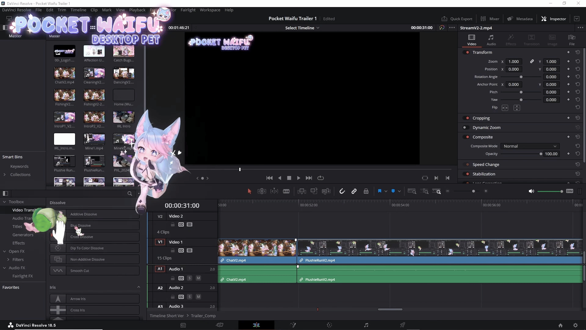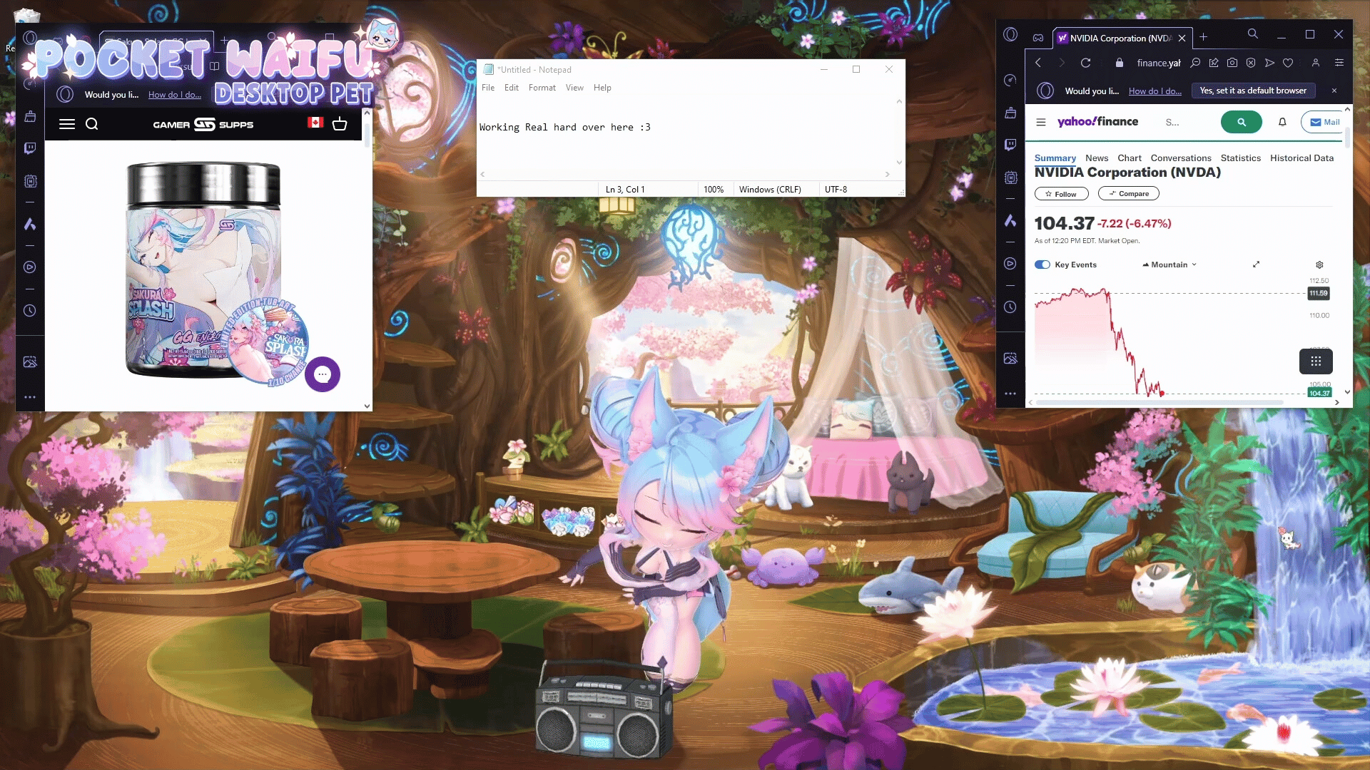 Elevate your desktop experience by adopting a desktop waifu! Similar to a tamagotchi, she will keep you company on your desktop while you work or play other games! Pat her head, feed her snacks, give her plushies, or go fishing. Bring a little joy and cozy vibes to your daily routine!