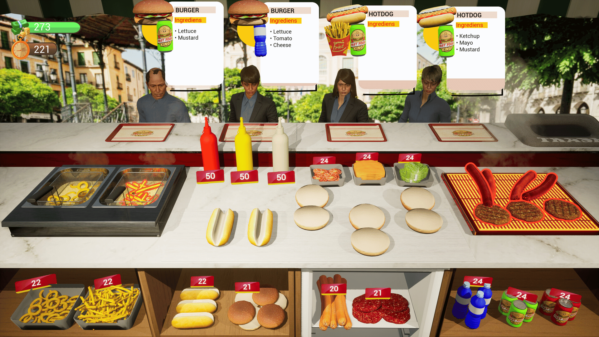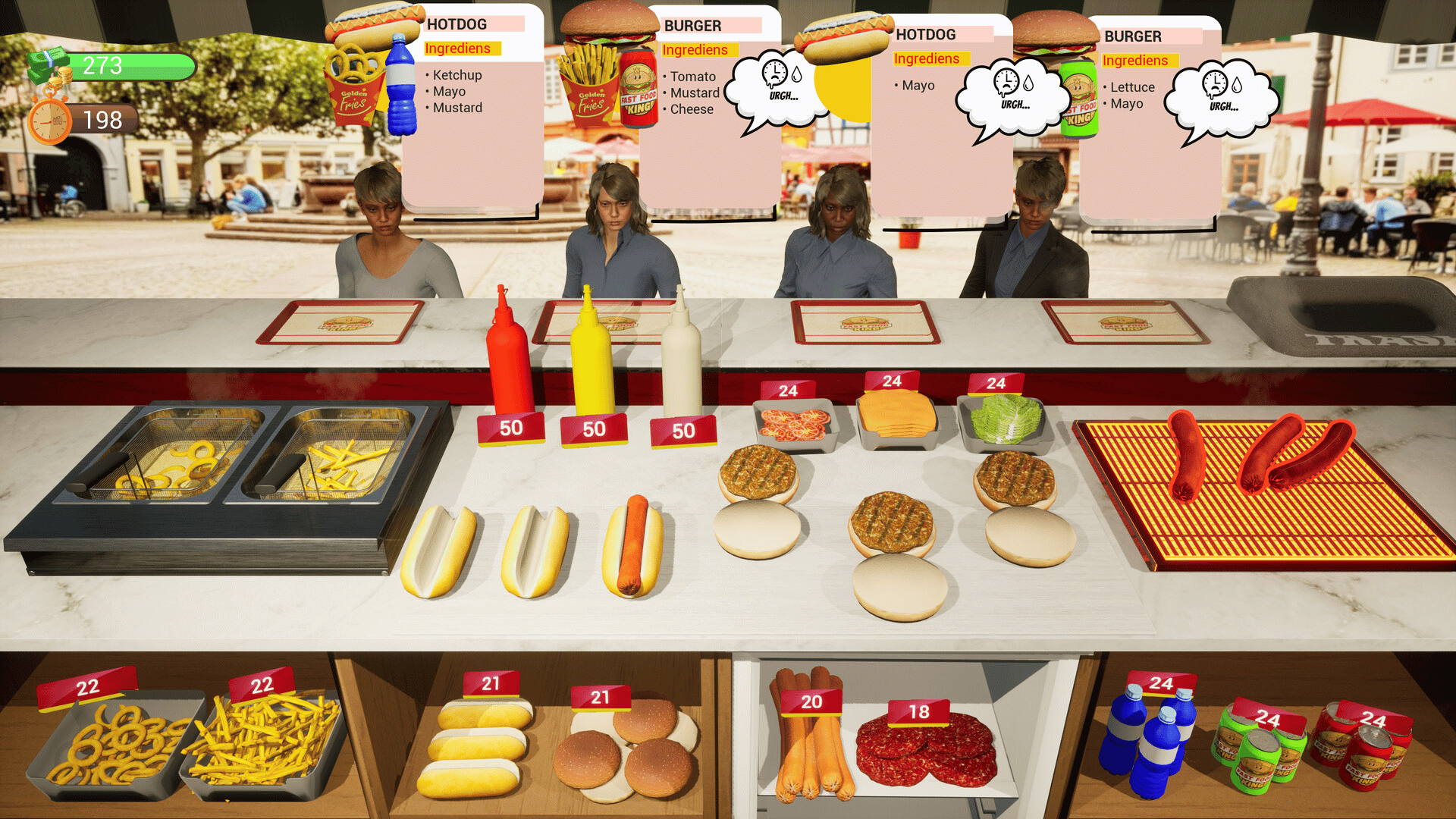 Serve hot dogs, hamburgers, and drinks in a fast-paced street food game. Manage orders, beat the clock, and keep hungry customers happy!