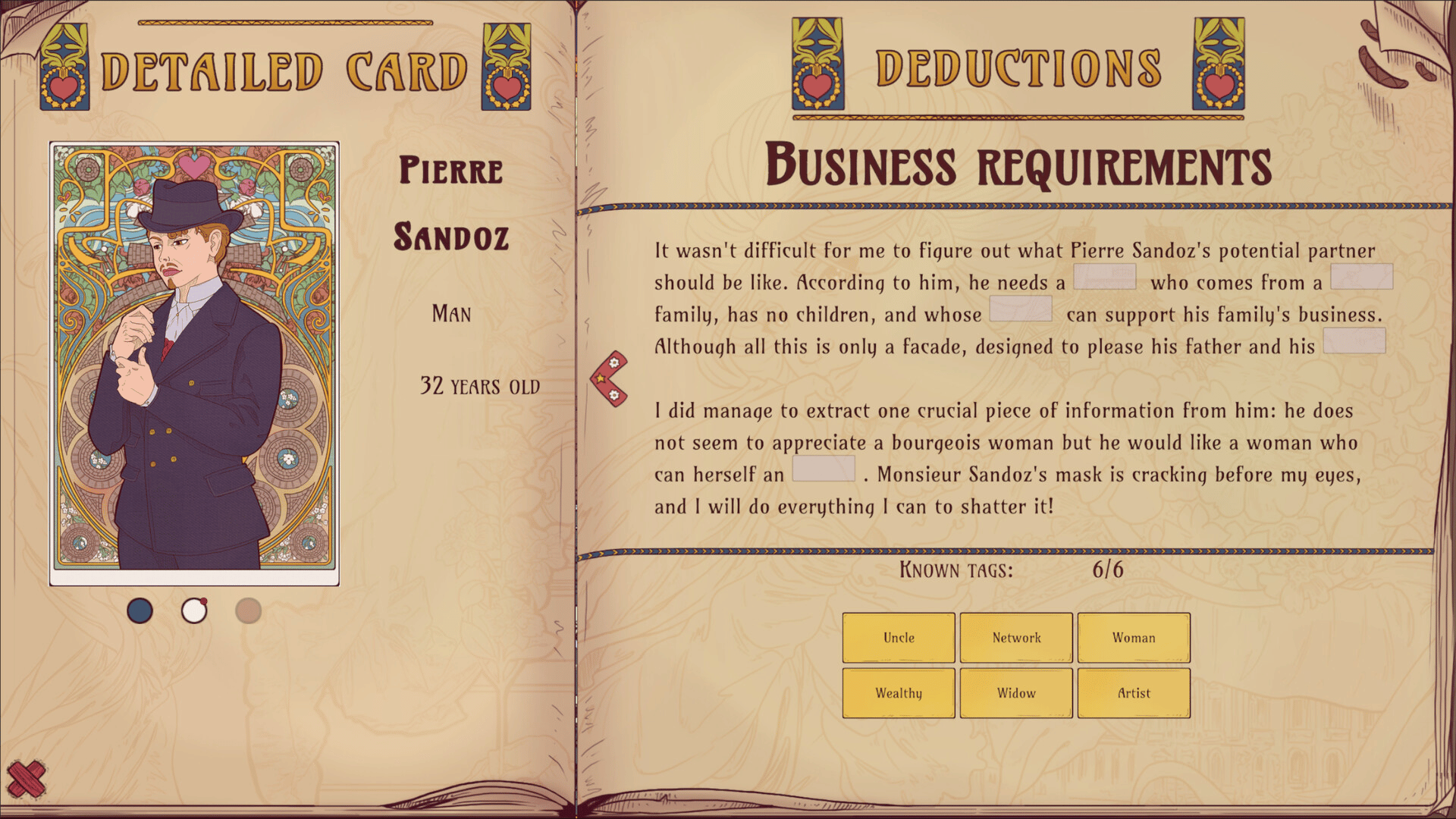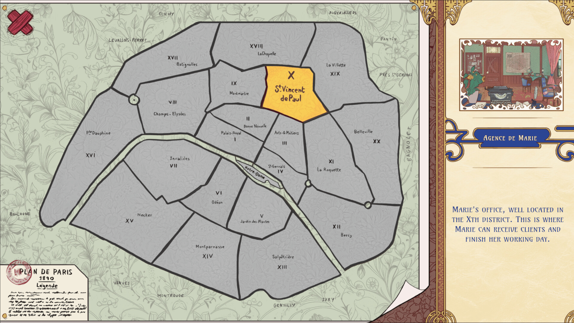Incarnez une détective de l’amour. Marie de Saint-Marc, gérante d'une agence matrimoniale à Paris, doit percer les secrets de ses clients et clientes et de leurs partenaires potentielles pour faire prospérer son affaire. Chaque rencontre est conçue comme une petite énigme et chaque confidence devient la clé vers un mariage réussi. Le destin de l’agence dépend autant de votre sagacité que de votre patience.