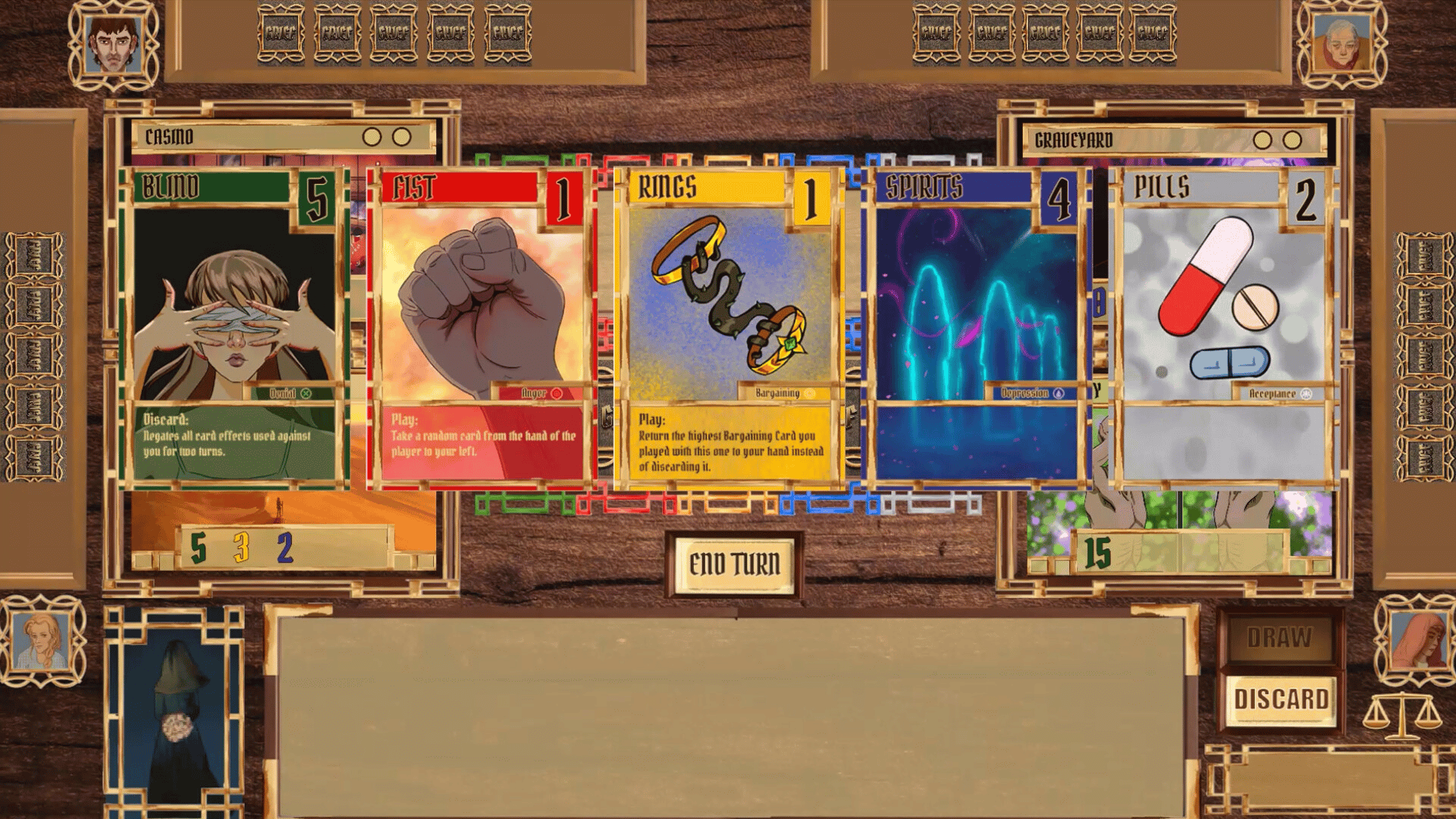 Grief is a competitive, turn-based digital board game for 2–5 players, focused on card play and hand management.Plan your cards and actions carefully, outmaneuver your opponents, and be the first to complete all five stages of grief represented by unique Grief Tokens.