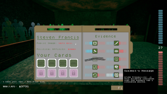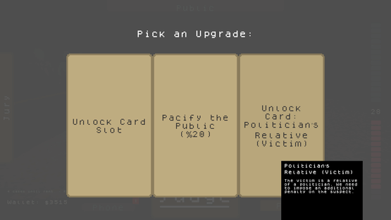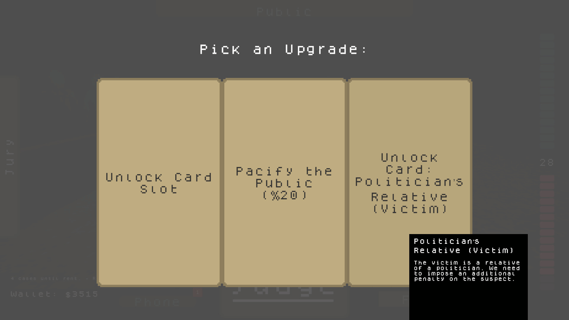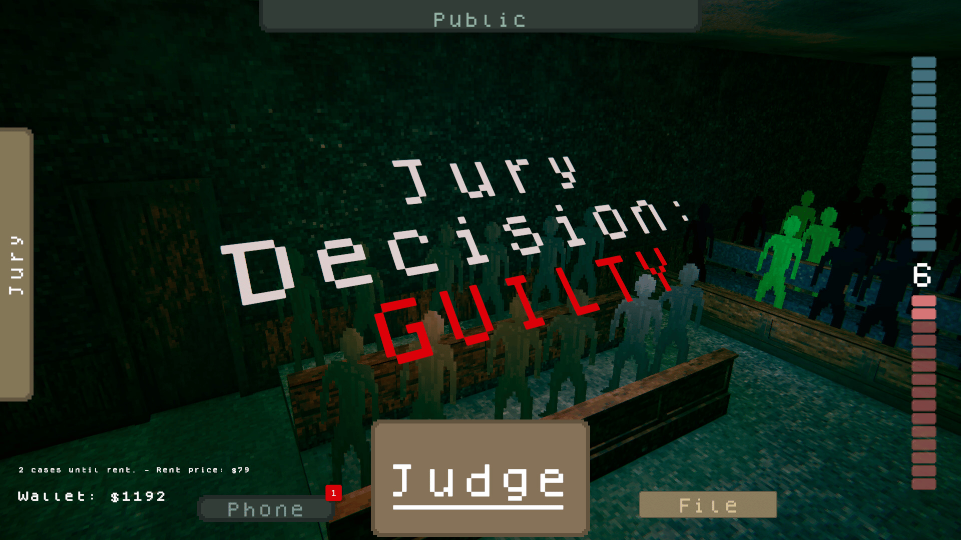 “Your Price, Your Honor.” is a game where you control the choices of a judge who is getting close to retirement. You must manage the public’s tolerance for injustice… and your own wallet.
