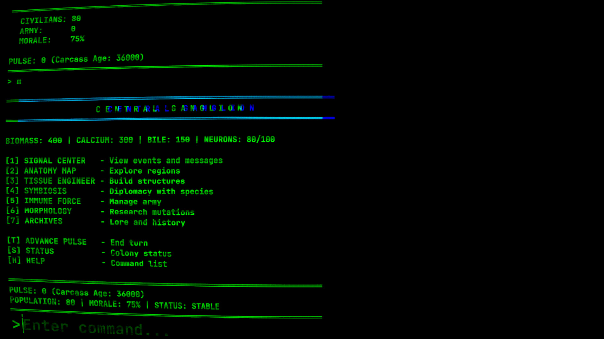 A deep roguelike colony RPG inside a dead god's corpse. Procedurally generated events, branching narratives, species with unique traits, and meaningful choices that shape your colony's fate. Every playthrough tells a different story of survival and evolution.