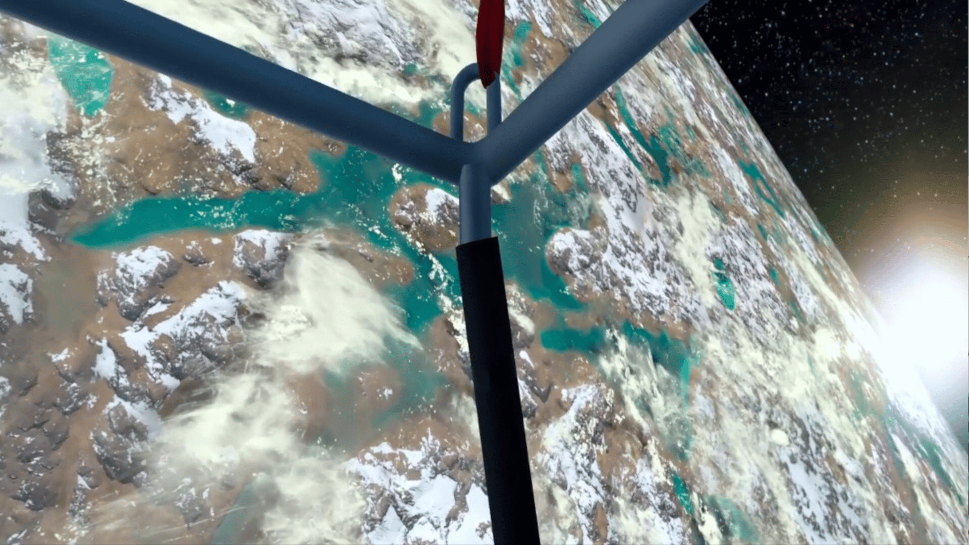 Simulation: Hot air balloon ride in dreamlike landscape in Arctic then, floating around worlds in cosmos with captivating music