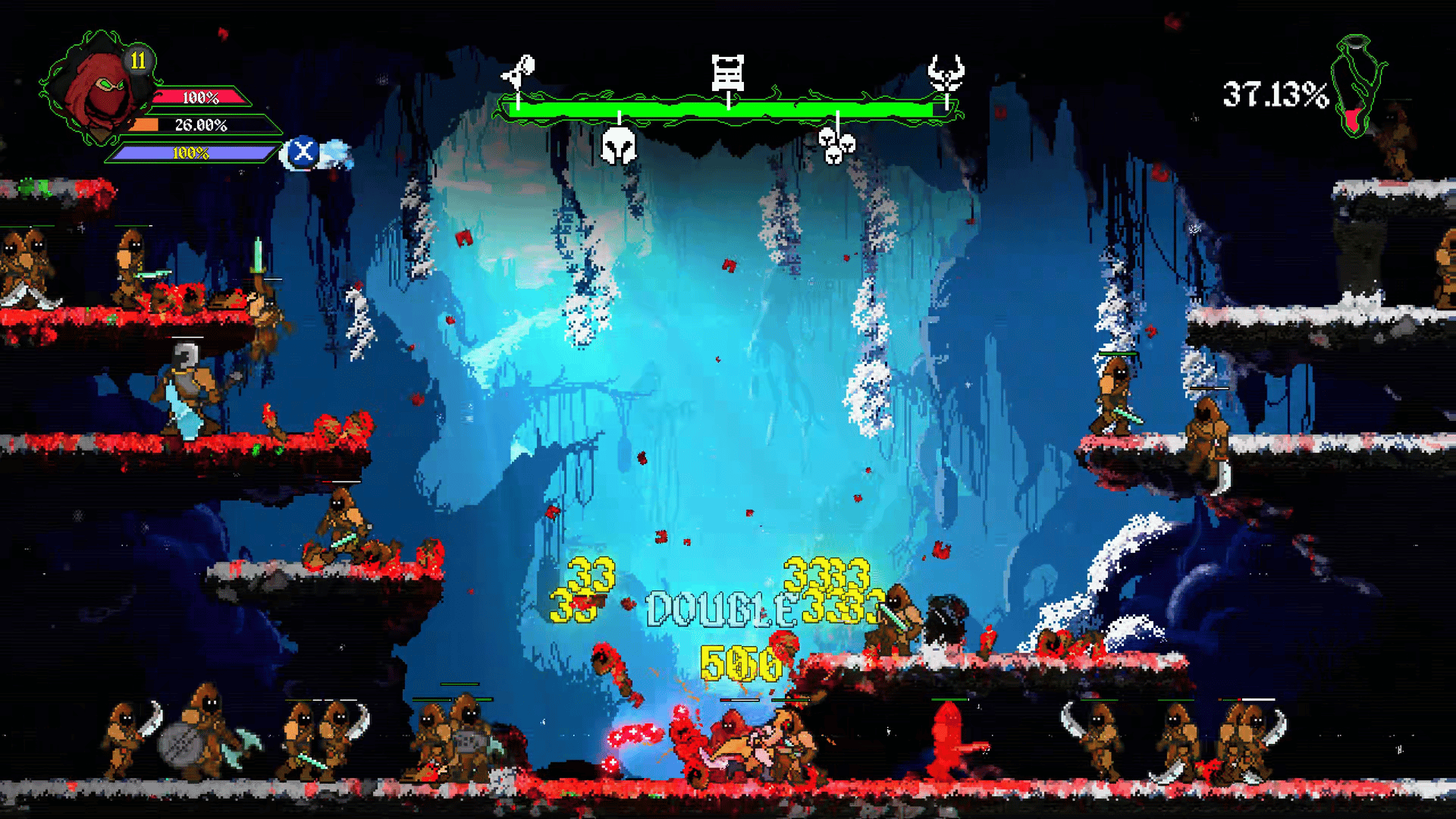 IGNOBLE is a one-of-a-kind, brutal incremental beat-’em-up platformer. Destroy enemies and harvest blood, bones, and marrow to grow stronger, unlock forbidden skills, and wipe out the Ignoble tyrants who dare threaten your master.
