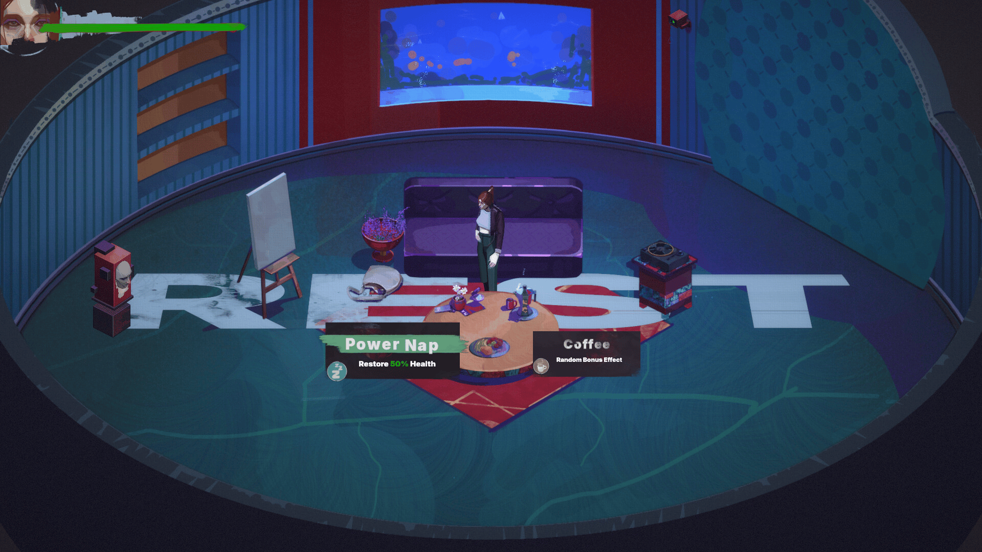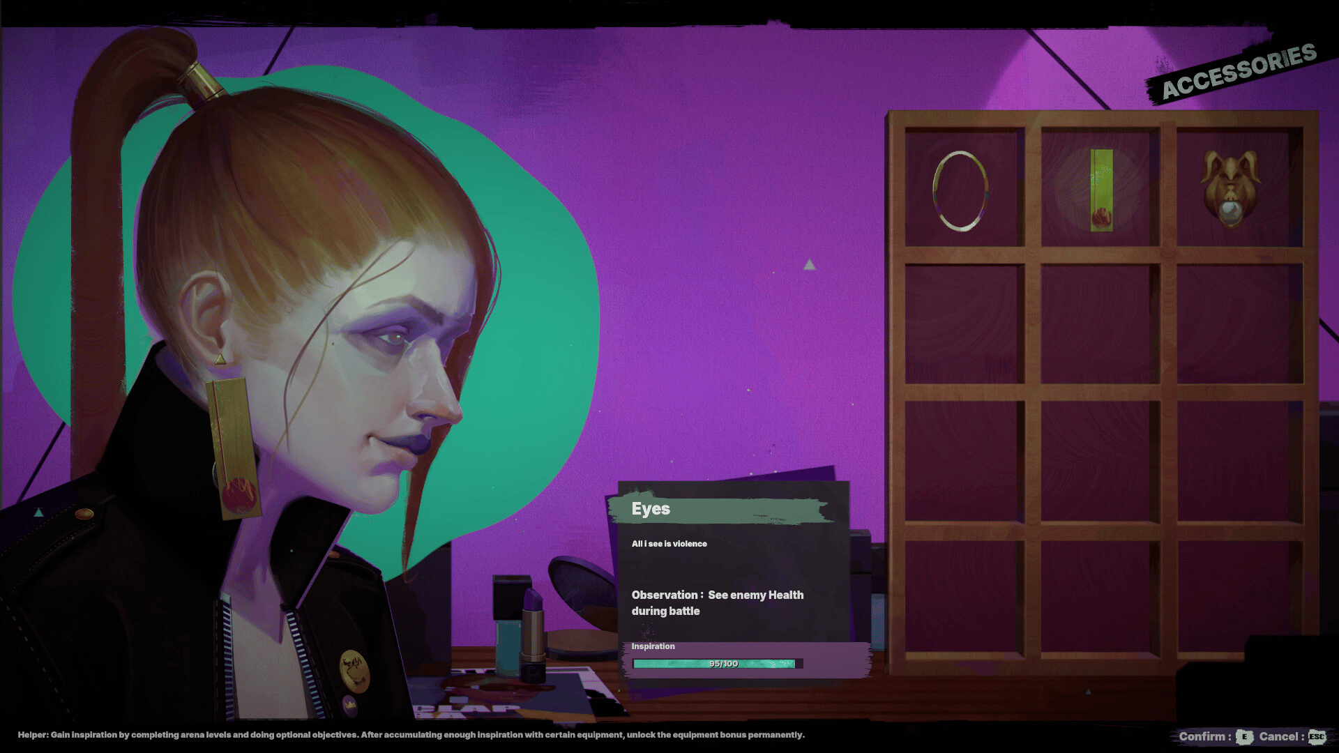 A Visual narrative about overcoming the status quo, Fight in a series of different Arenas Levels, In your downtime cook different meals with unique effects and craft equipment to increase your chances.