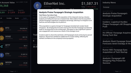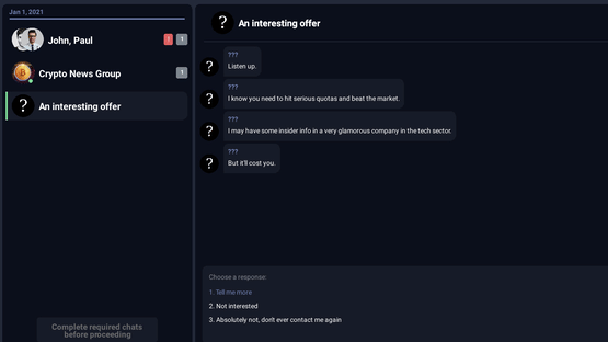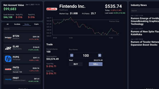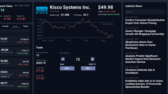 Play as a day trader gambling on people's pension money and try to beat the stock market. Engage in a comedic story with multiple endings. Meet different characters and get insider info to use for your own advantage. Gamble on cryptocurrency and quickly react to market events.