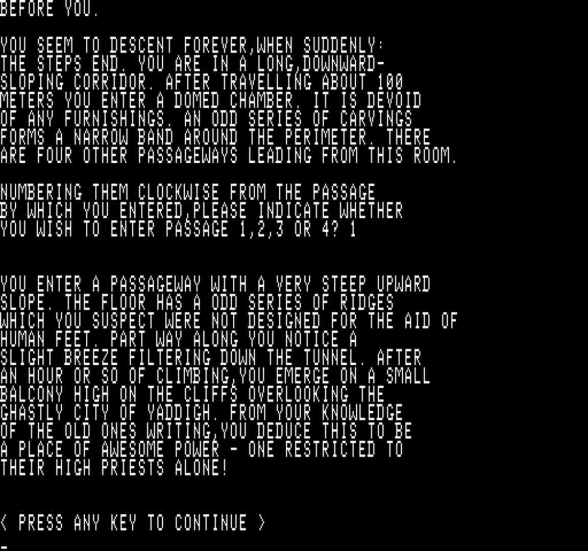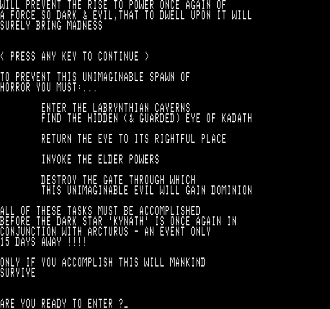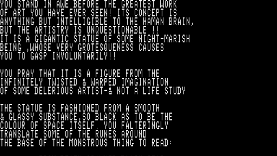 A Lovecraftian adventure inspired by the book "The Dream-Quest of Unknown Kadath". A text-only game with choose-your-own-adventure gameplay style. Made in 1979 by Gary Musgrave for the Altair 8800 and the Exidy Sorcery. In 1983 the Commodore PET got a "remake" of the game by the name "Eye of Kadath"