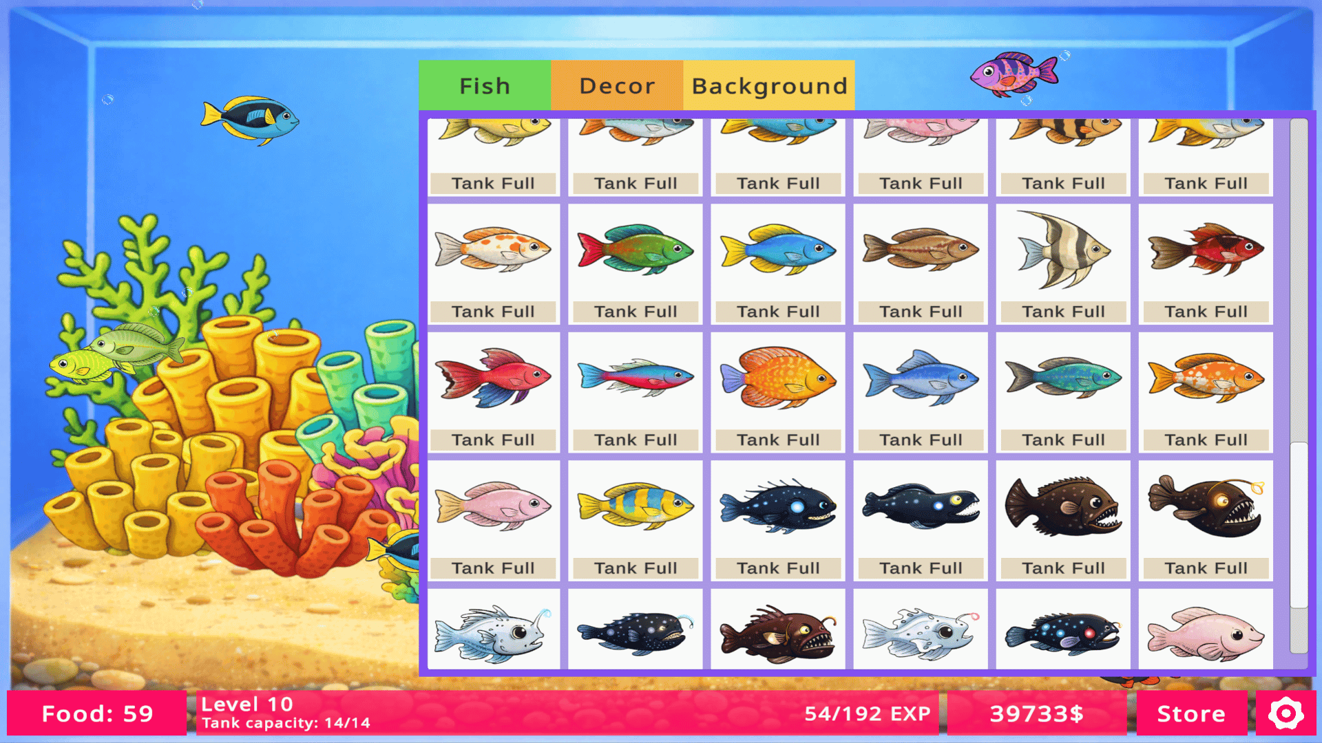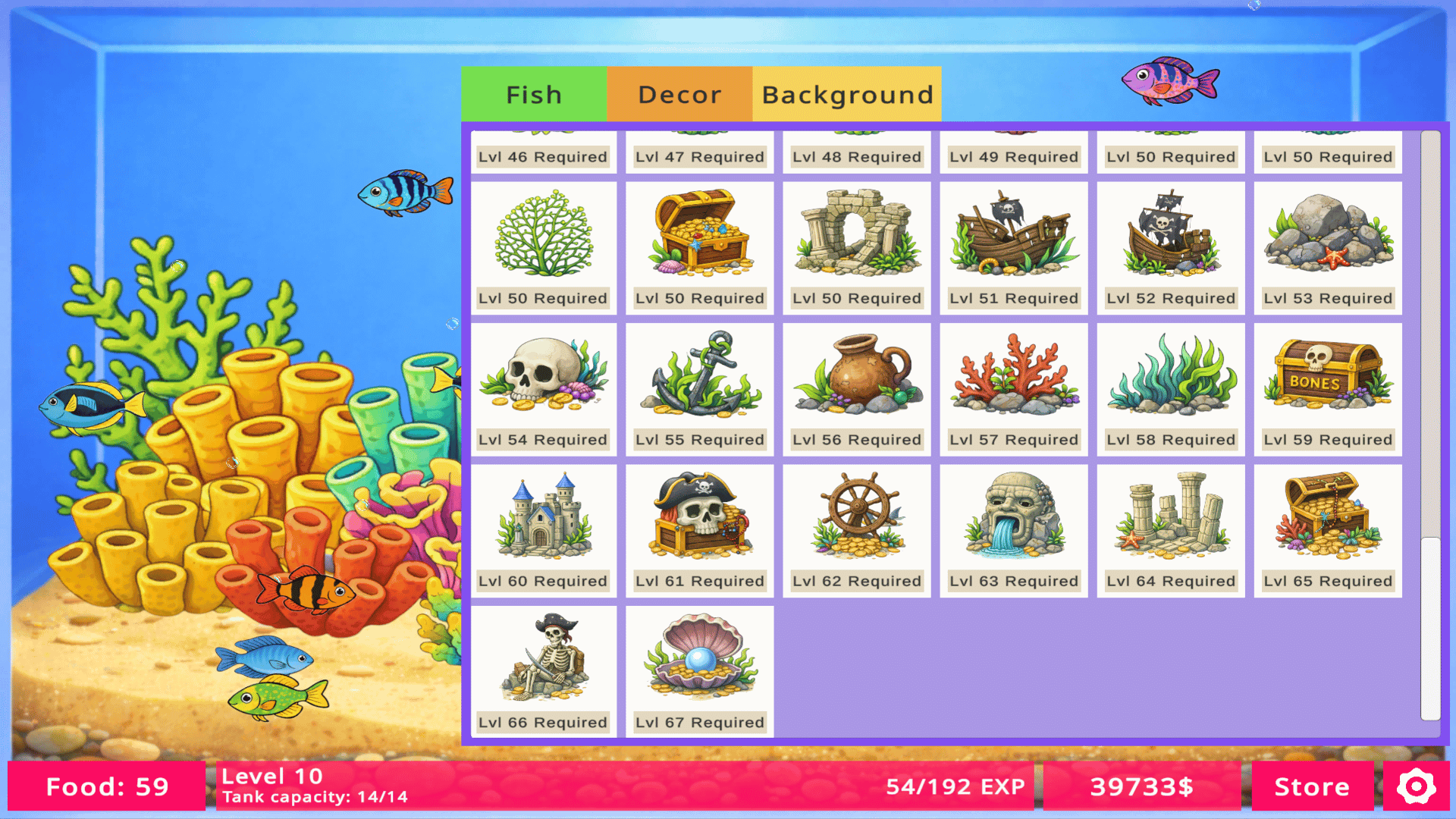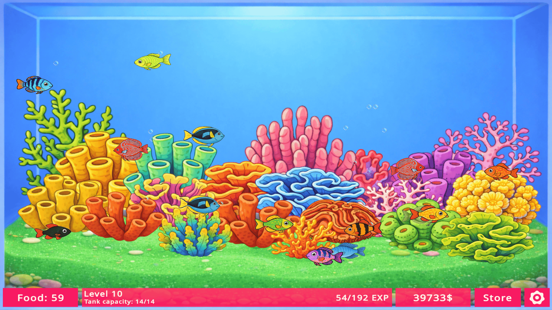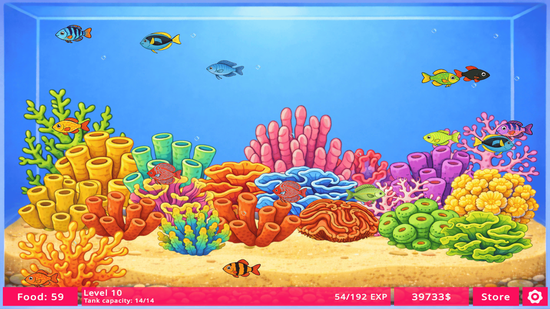 Build and manage your own aquarium by collecting fish, earning money, and unlocking decorations. Feed your fish, clean the tank, and enjoy relaxing idle progression in this cozy 2D aquarium simulation.