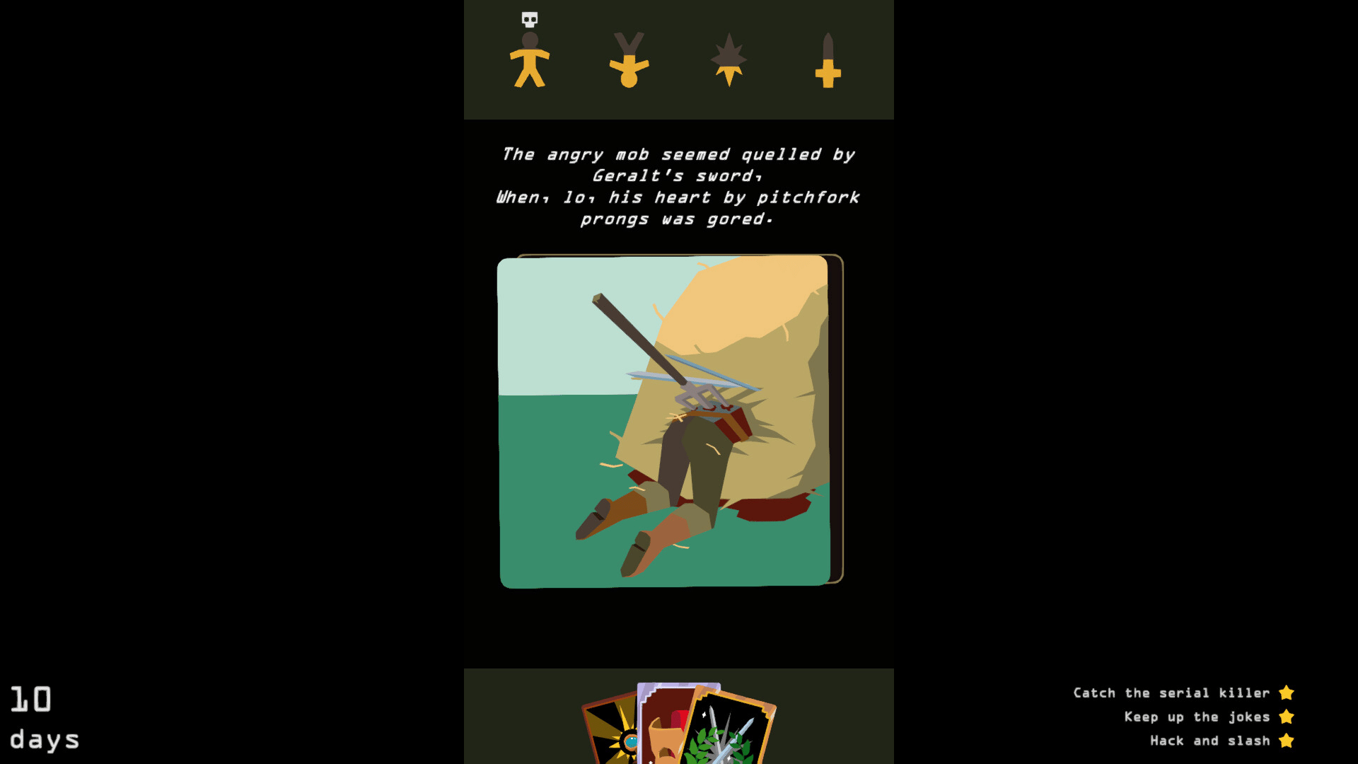 Adventure as Geralt through the ballads of Dandelion. Swipe right, swipe left, seek glory, find death! Will you hunt monsters, upset the locals, or run a hot bath? Compose an inspiring epic to claim immortality.