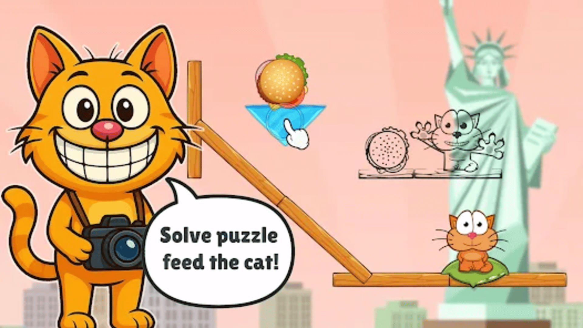 Hungry Cat: Puzzle Game Adventure - A Fun Brain-Teasing Journey! Ready to challenge your brain with a relaxing puzzle journey full of food, fun, and furry cuteness? Meet the adorable orange cat who’s always hungry - and always on the move! In Hungry Cat, a brain-teasing physics-based puzzle game, you’ll travel across the globe and solve clever block puzzles to roll delicious local food into the paws of your favorite kitty. Whether you love logic games, enjoy testing your quiz-solving skills, or just want a light, relaxing game with cute characters, Hungry Cat is your perfect choice.