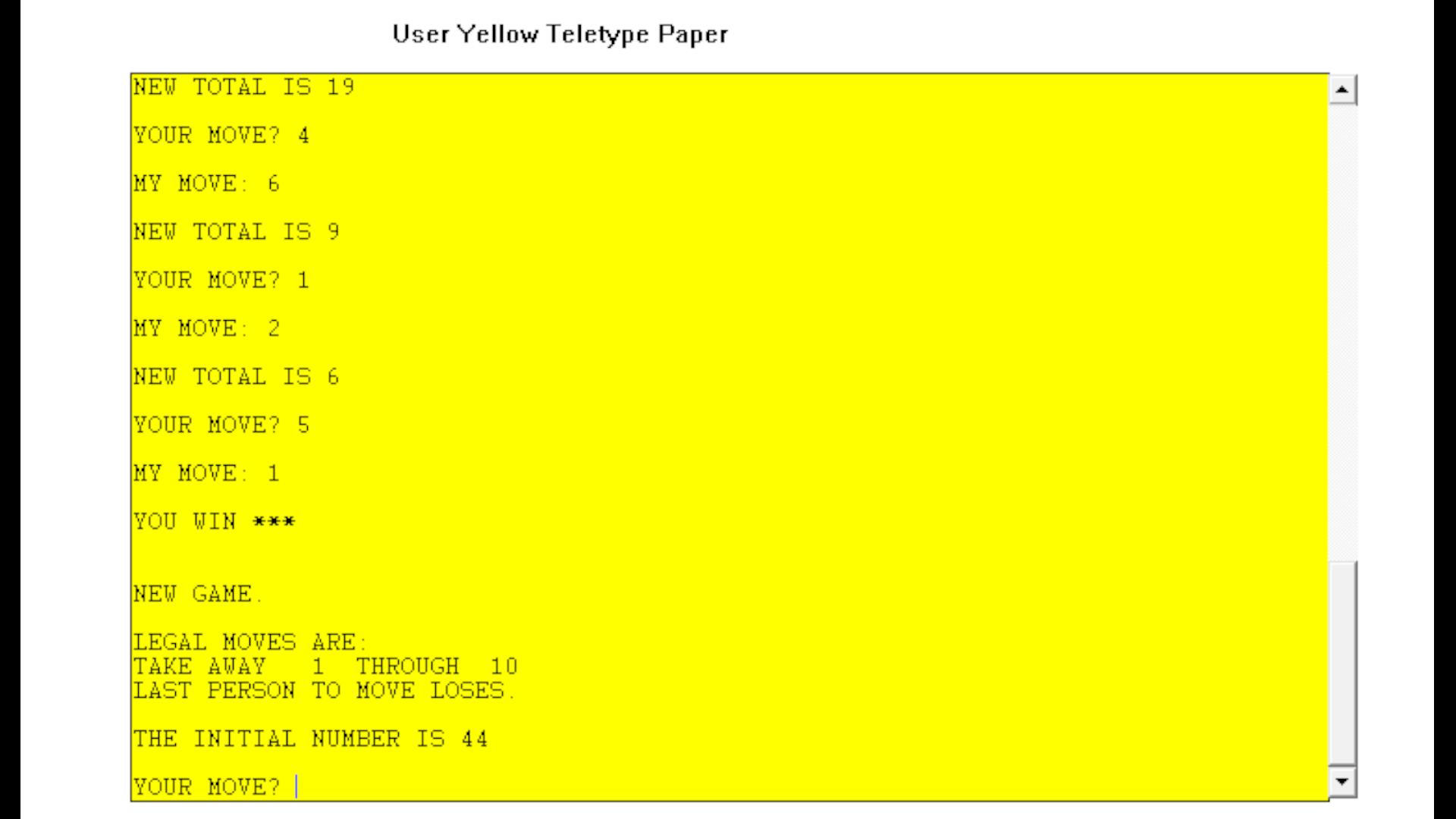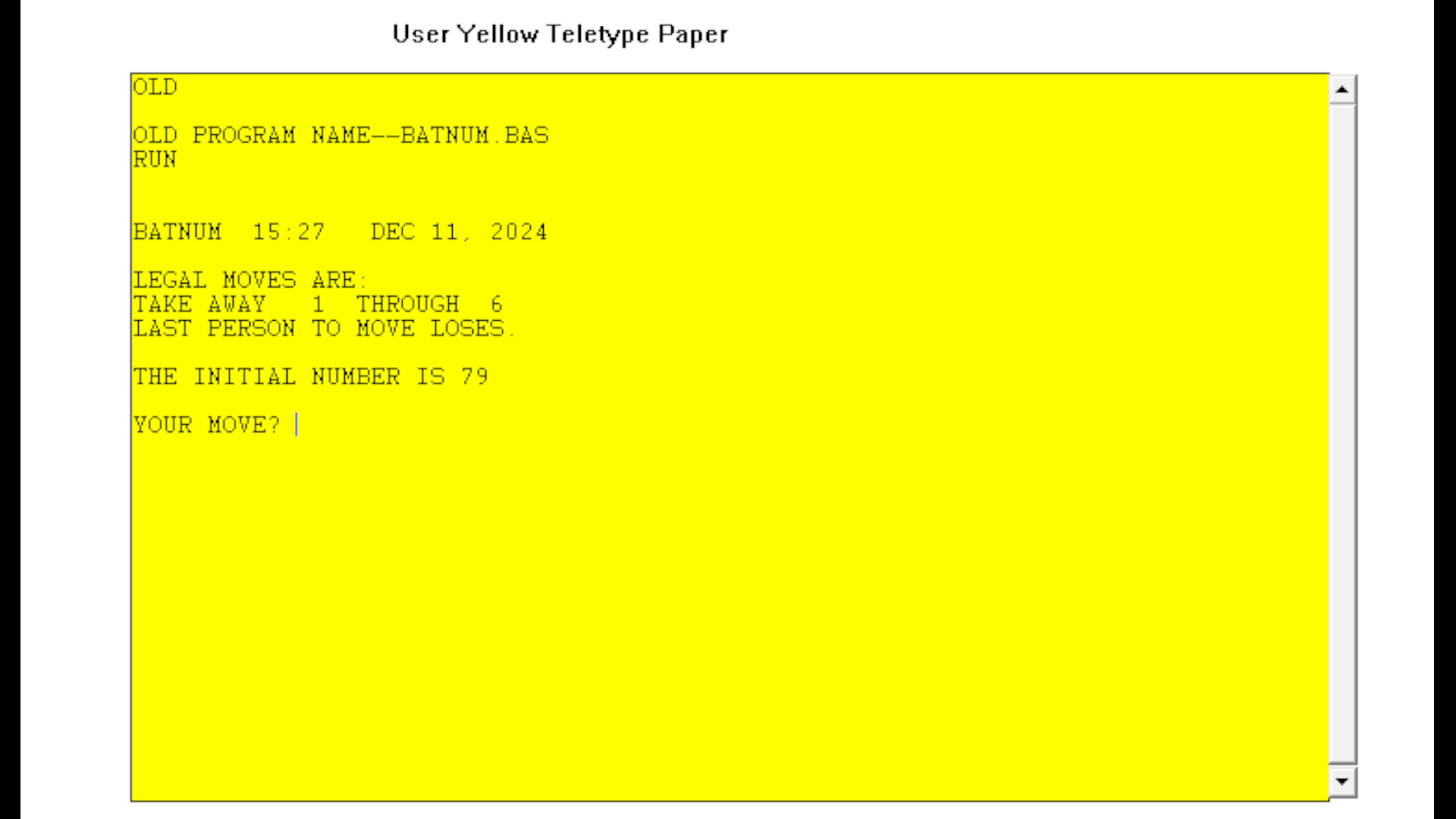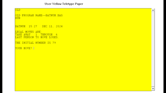 Batnum, a portmanteau of "battle of numbers" is an early BASIC game based on the family of "object pile" games, which includes Nim. The player and computer take turns removing objects from a pile, with there being a set minimum and maximum amount of objects that can be removed per turn. The objective is to force the computer to take the last object.