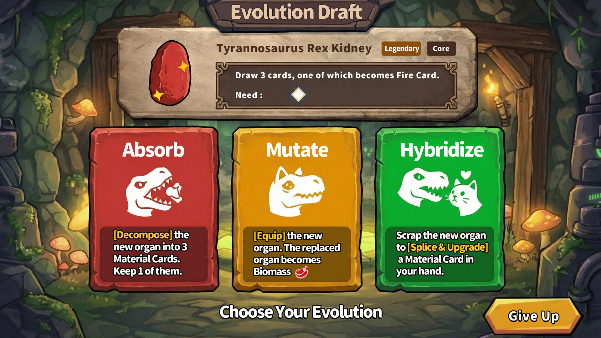 EVO Card is a roguelike card game in which players evolve creatures by assembling biological components through deck-building mechanics. Each run features randomized encounters and progression, encouraging strategic adaptation across repeated playthroughs.