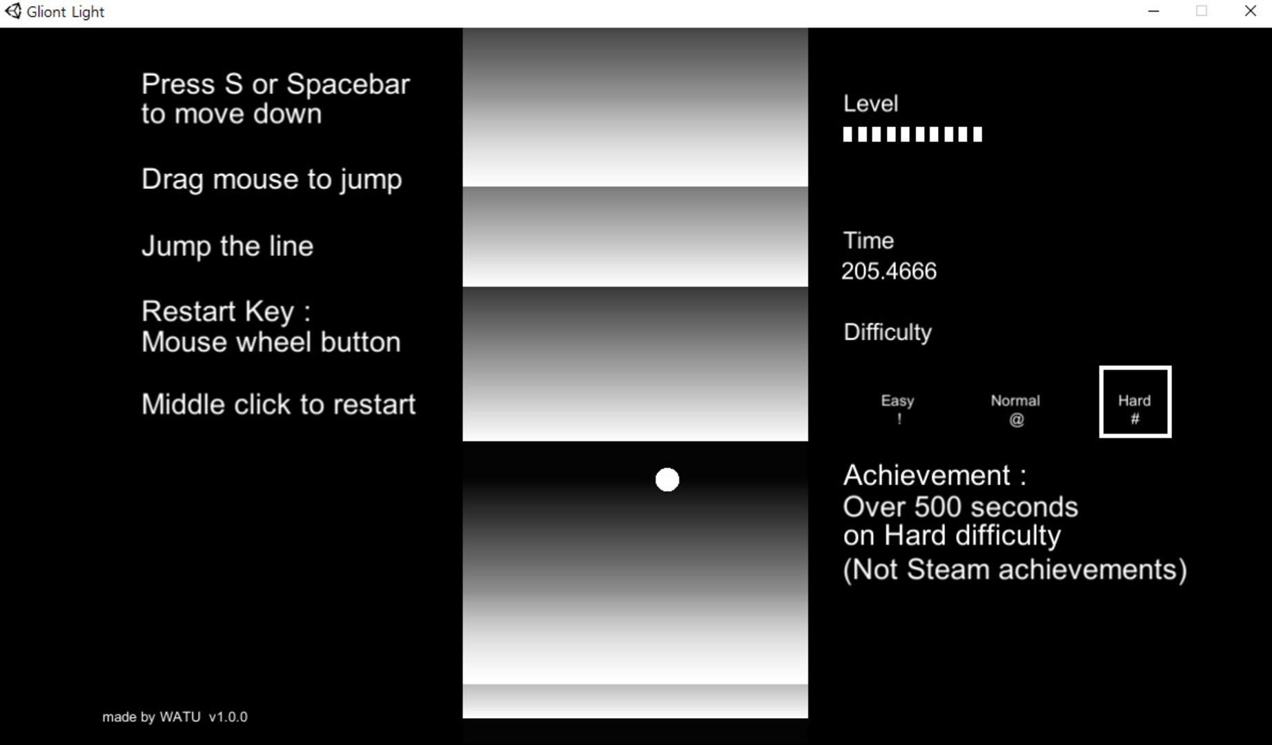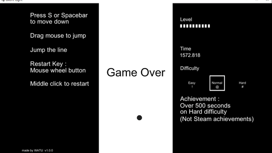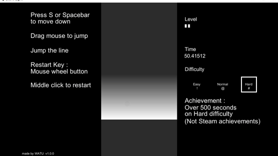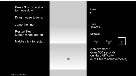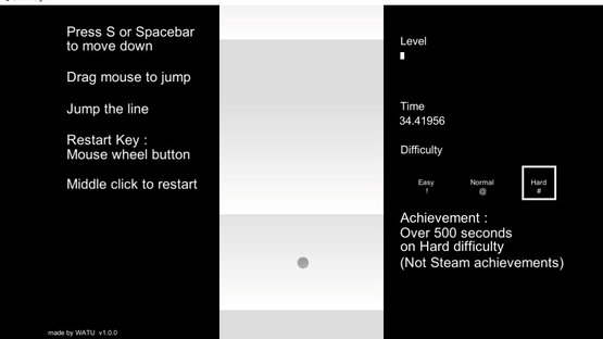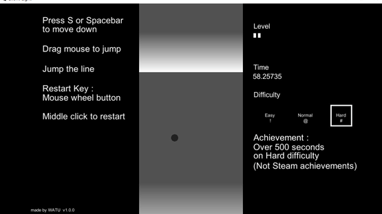 Jump over a line that goes down with a random speed Drag left button of mouse to Jump hold down the right mouse button to move down When the player touches the line, the screen goes white, and when it becomes completely white, it's game over Survive as long as possible