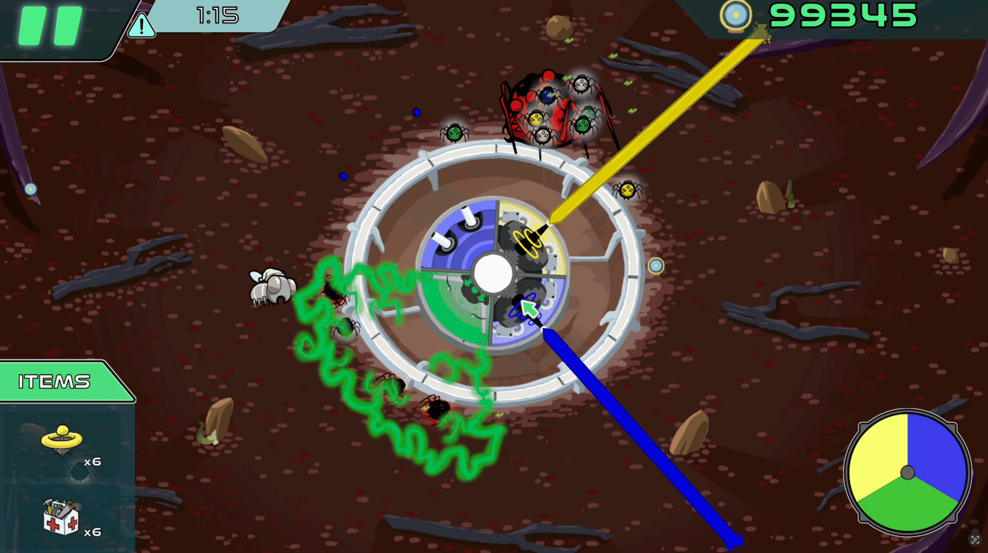 Chromatic Battles is a 2D action/strategy game with tower defense mechanics and color-based combat. The player defends a rotating ship against enemy waves, damaging them only with bullets that match their color. It features planet-based progression, an inter-level upgrade system, and a cartoonie visual style.