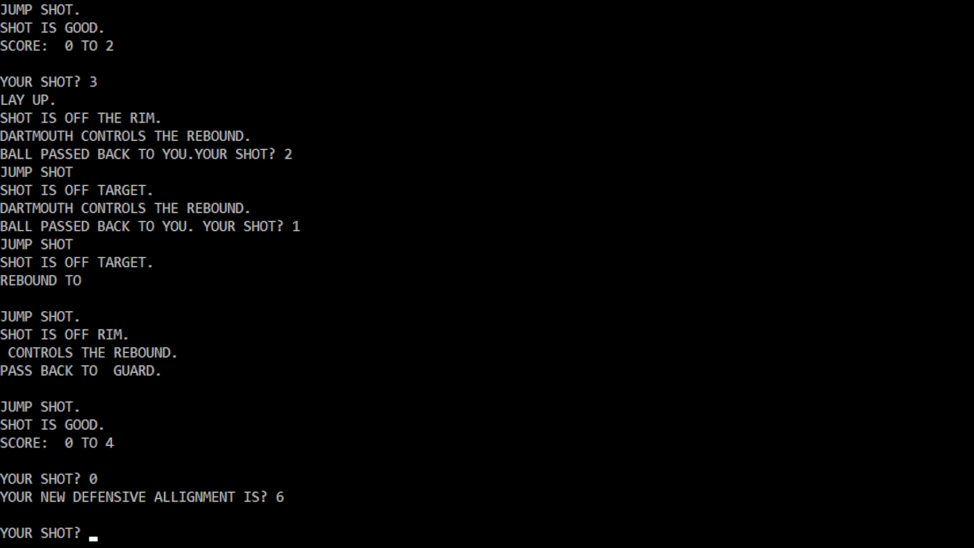 The first Basketball video game. You play against the computer in a text-based game of Basketball, with the ability to select both defensive setup and offensive plays each turn.