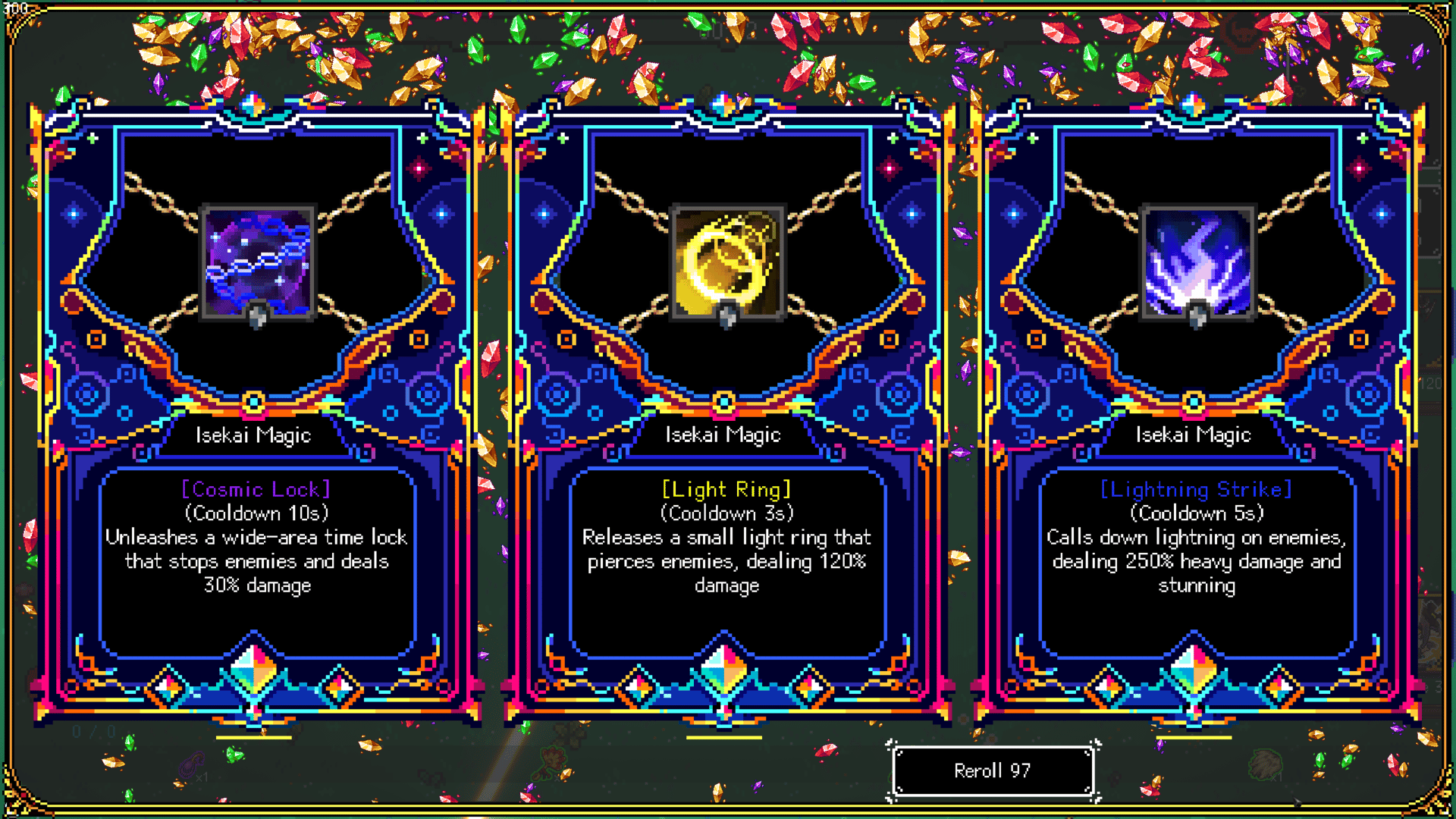 “Isekai HKV” is a 2D top-down pixel-art roguelike themed around VTubers traveling to another world. Players take on the role of the hero “DD,” gain the cheat skill “Unlimited Gacha,” and adventure with VTubers to defeat the Demon King!