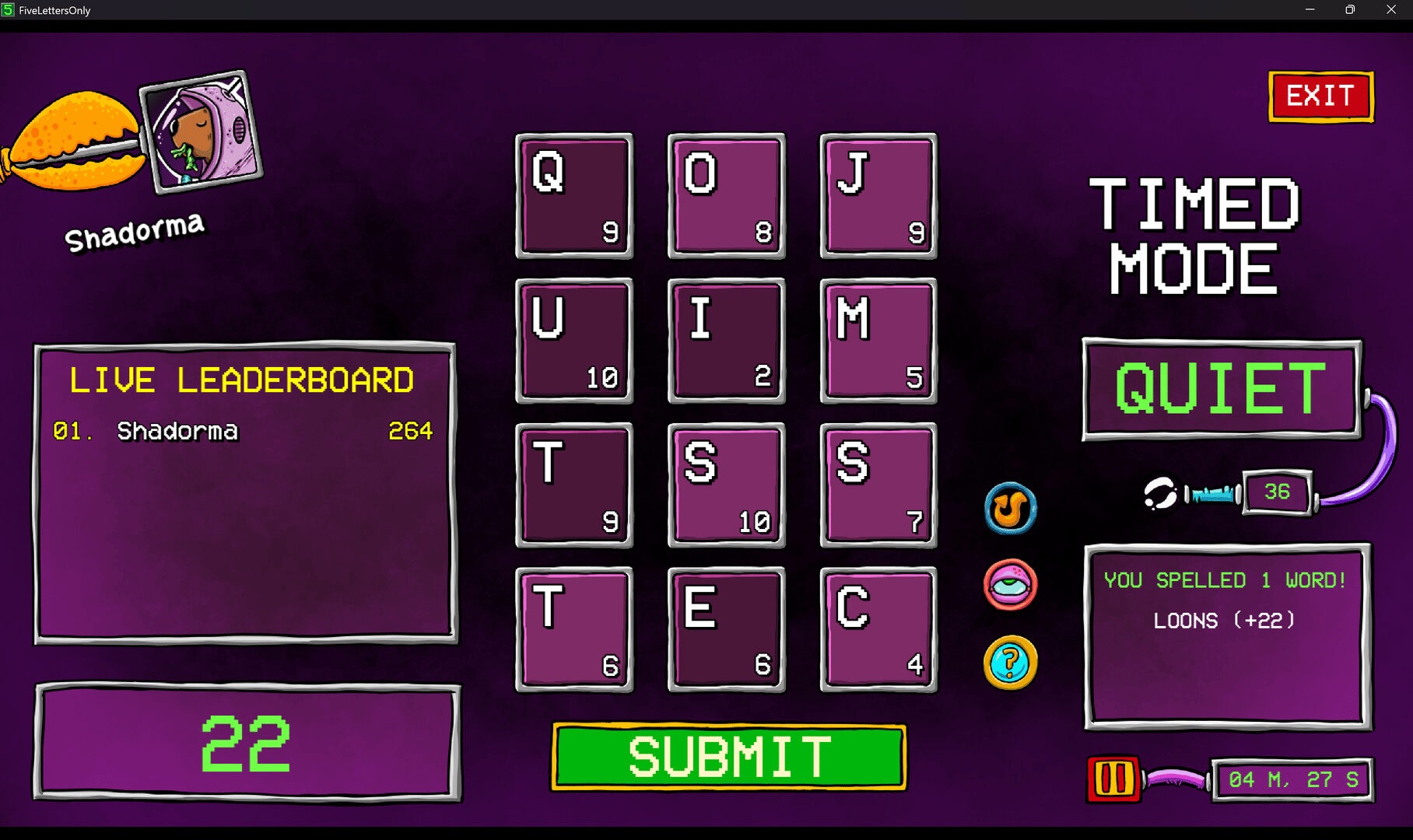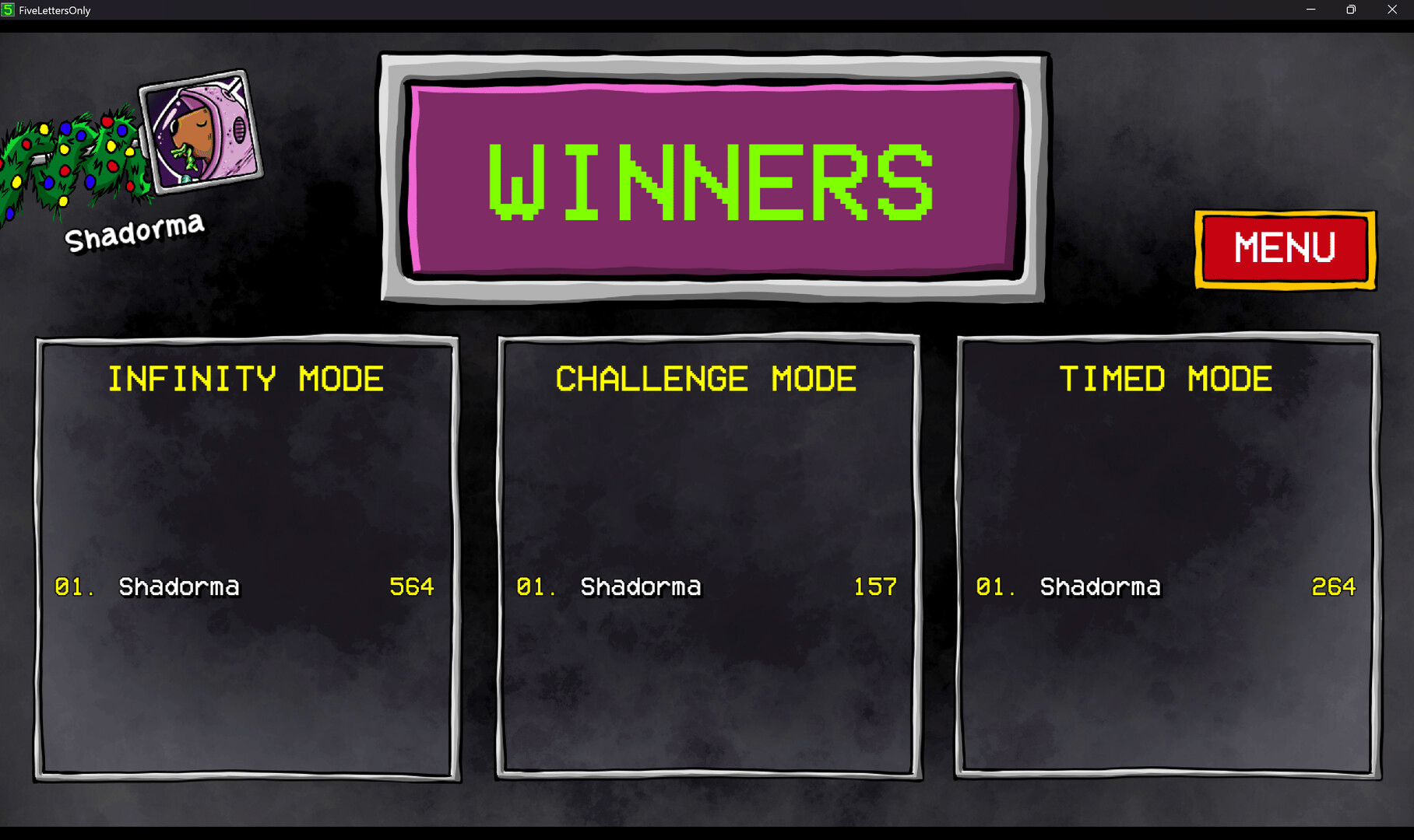 Five Letters Only is a fun, single-player, competitive word game. Submit 5-letter words to reach the top of each leaderboard.