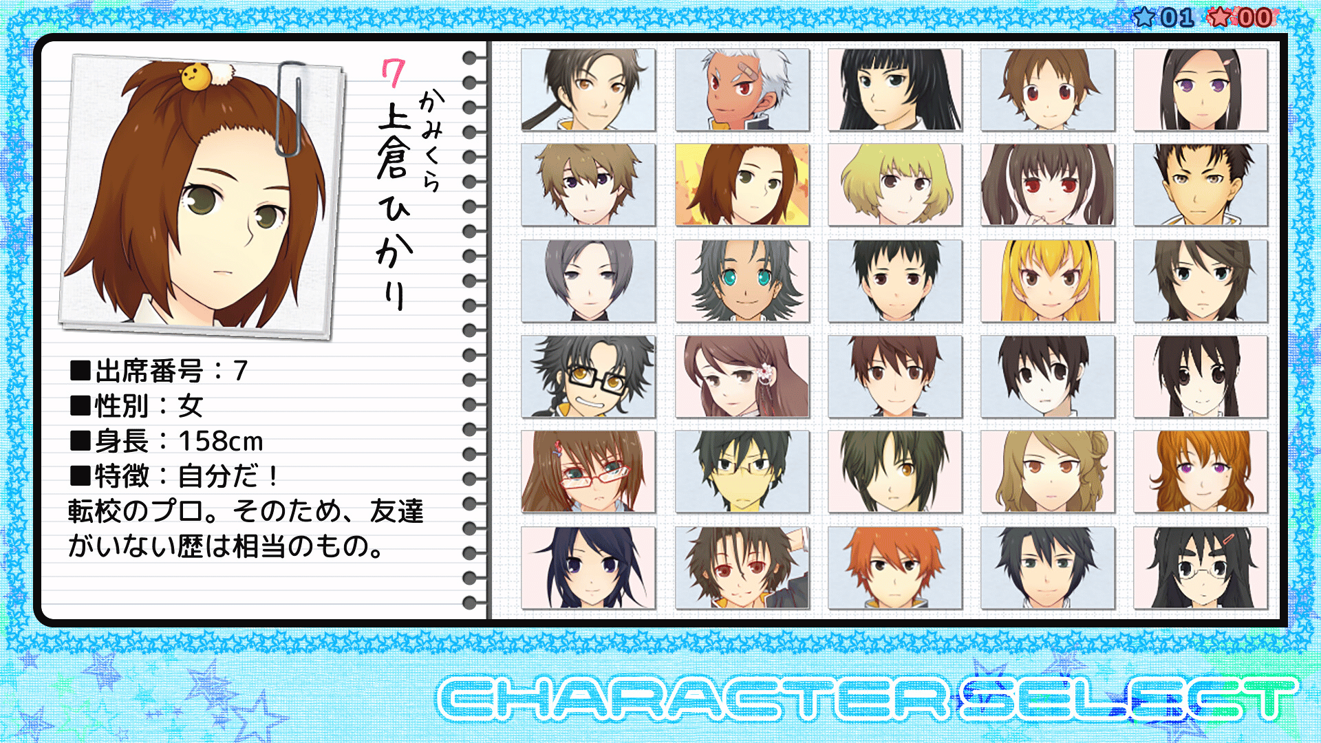A manga-style visual novel game featuring 30 high school students. Hikari Kamikura races around Heisei High School in an attempt to change her friendless situation!