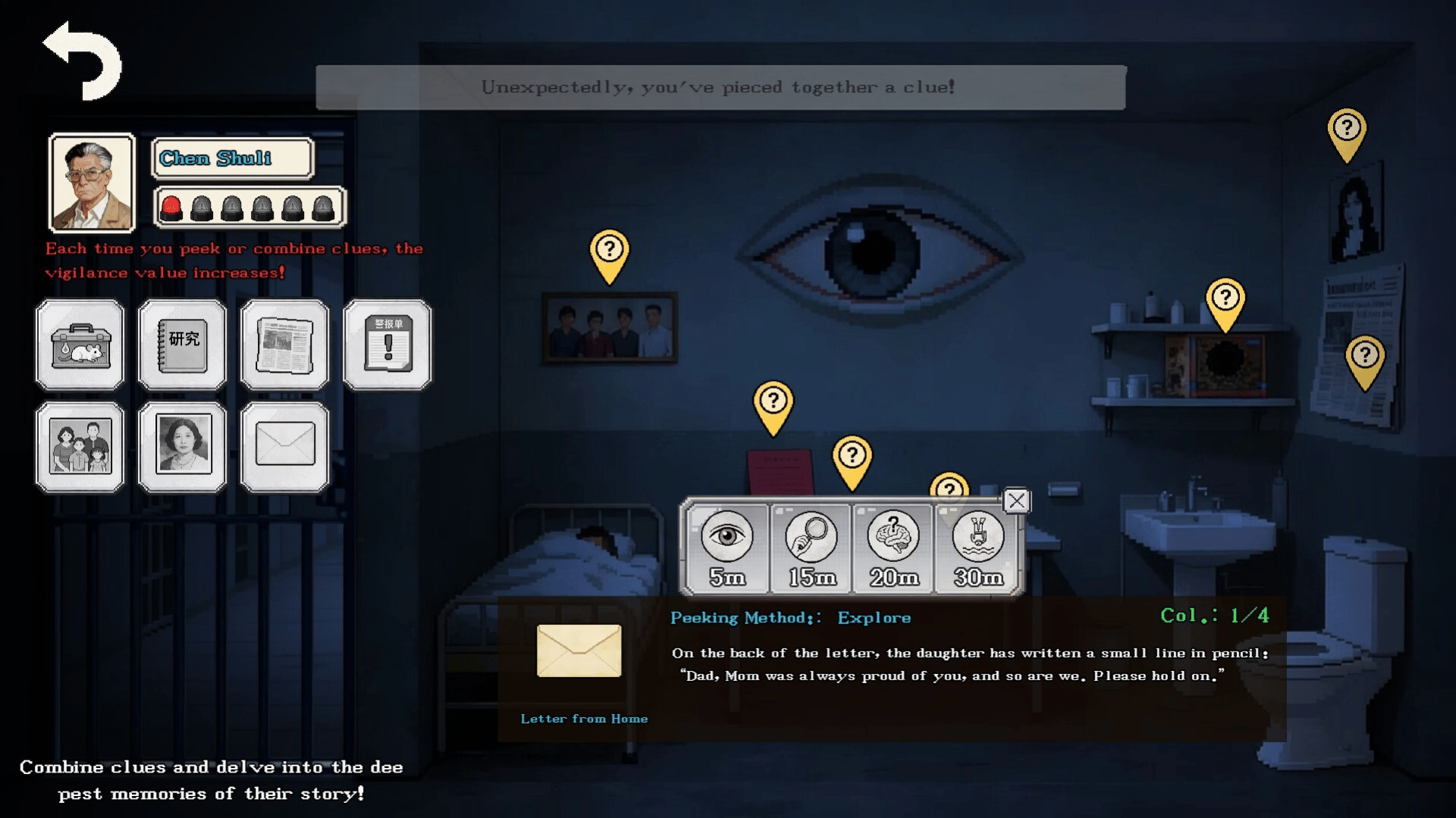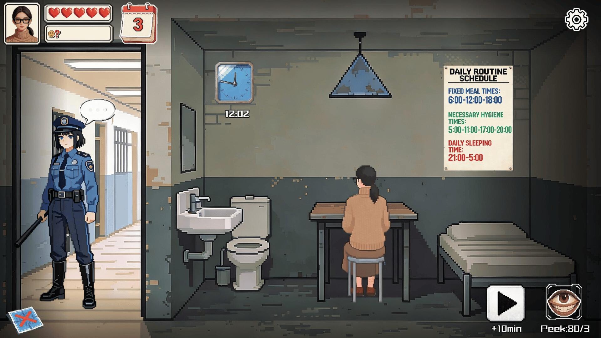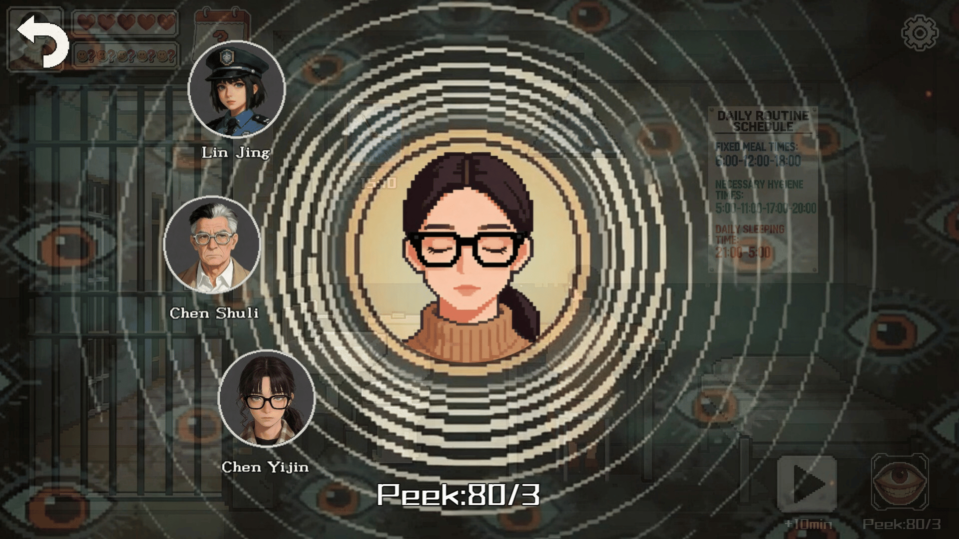 Peeping​ is a psychological survival game where you, a detained "supernatural suspect," must balance pretense and madness during a 31-day prison observation.