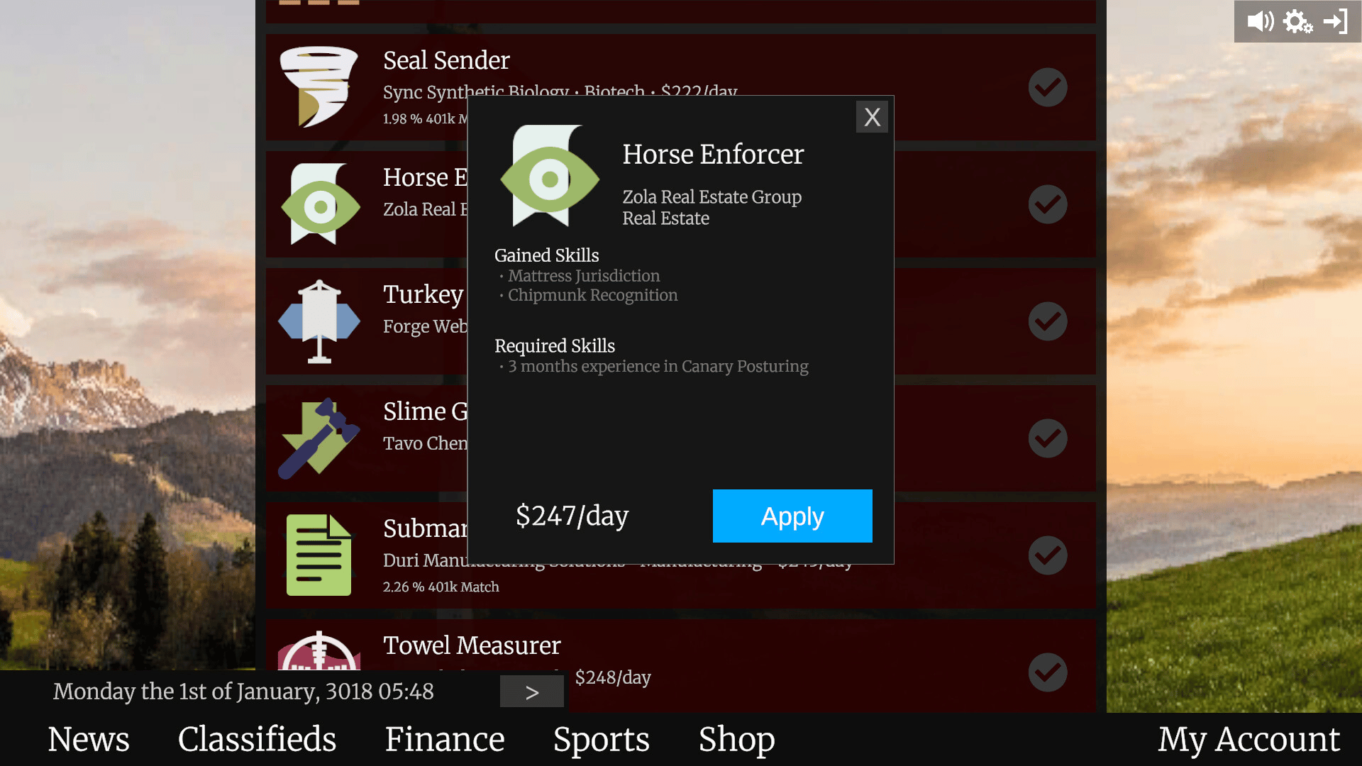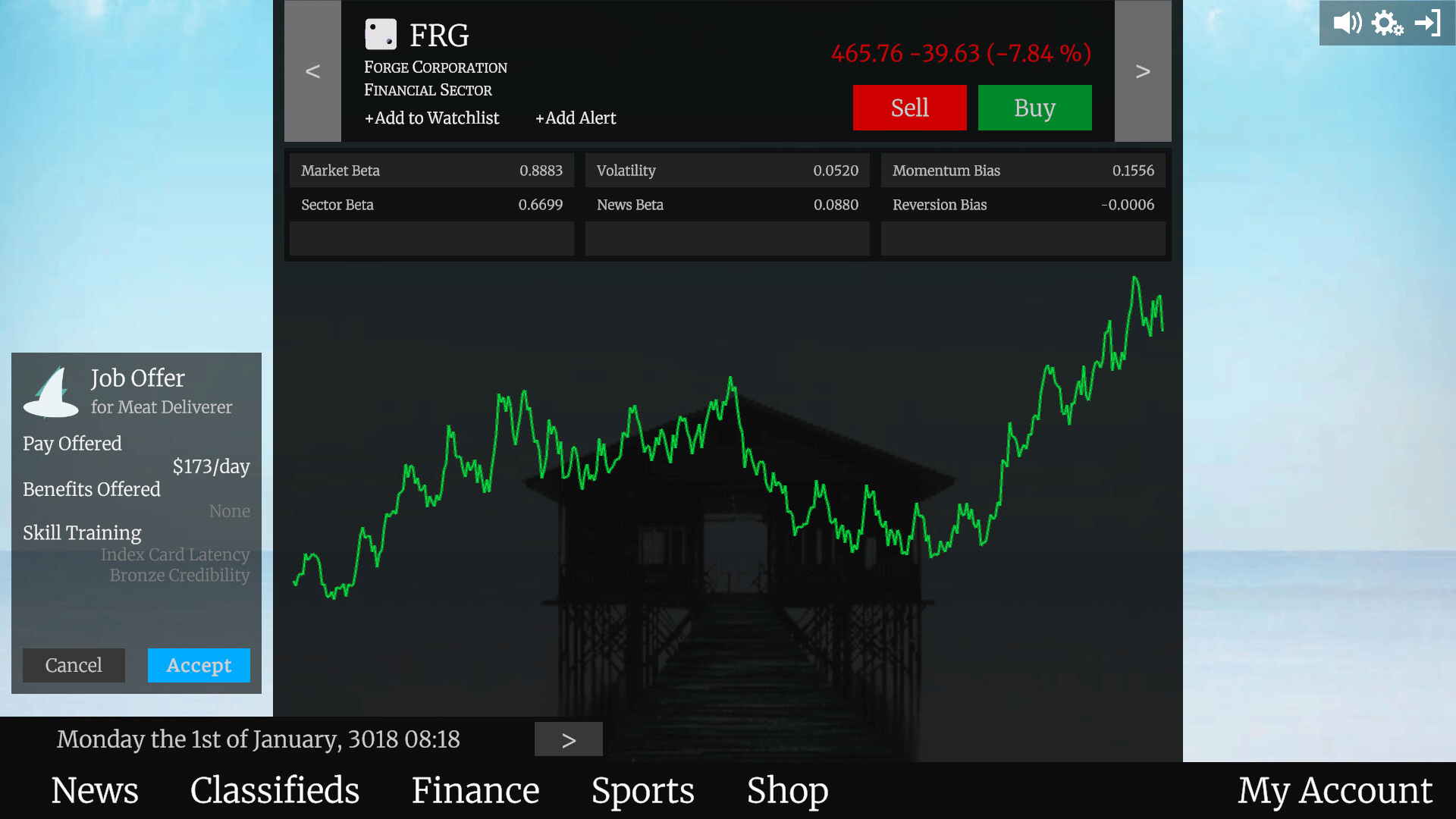 The money management simulation where you work, trade, bank, and gamble in a procedurally generated world. Browse the job market, gain skills through employment, buy stocks, trade options, place risky bets, and hit it big in a world that's different every time you play.